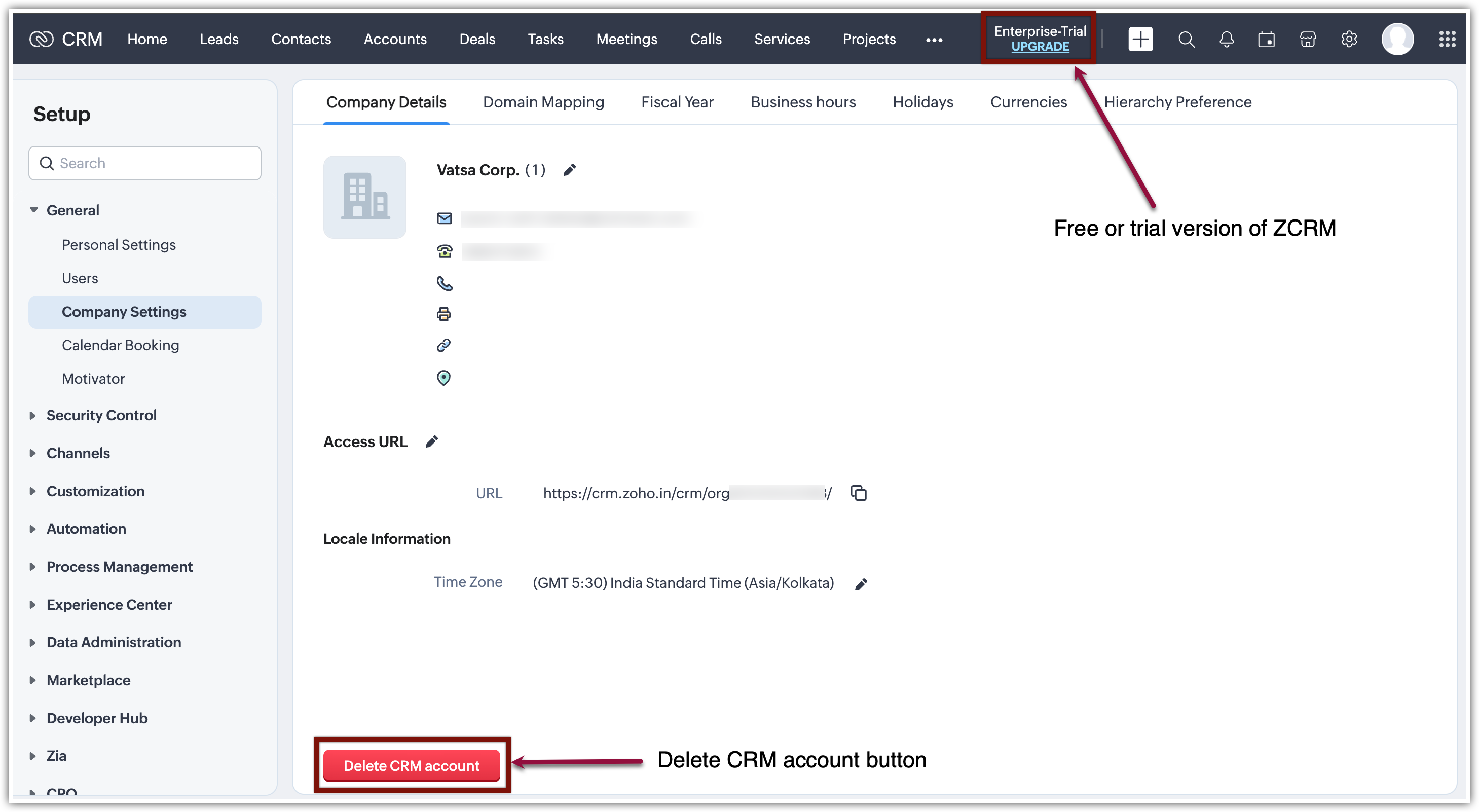 - După ce ai făcut downgrade la ediția gratuită a Zoho CRM și a rămas un singur utilizator, adică Super admin, vei primi opțiunea de a-ți șterge contul CRM după 7 zile.