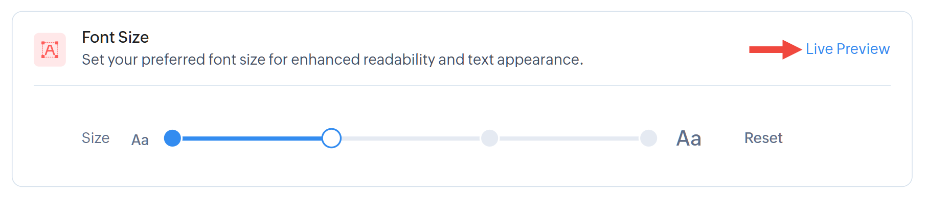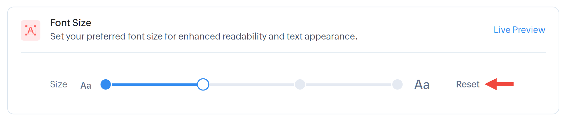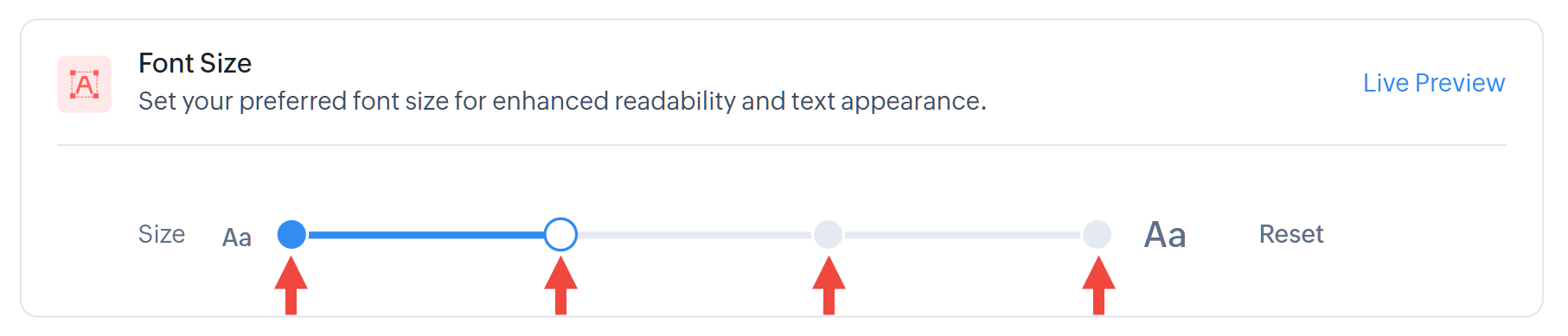 De multe ori, utilizatorii cu vedere slabă vor dori să îmbunătățească lizibilitatea CRM-ului fără a fi nevoiți să mărească și să micșoreze de mai multe ori. În astfel de cazuri, pot ajusta dimensiunea fontului alegând din patru dimensiuni: Small, Default, Large și Largest.