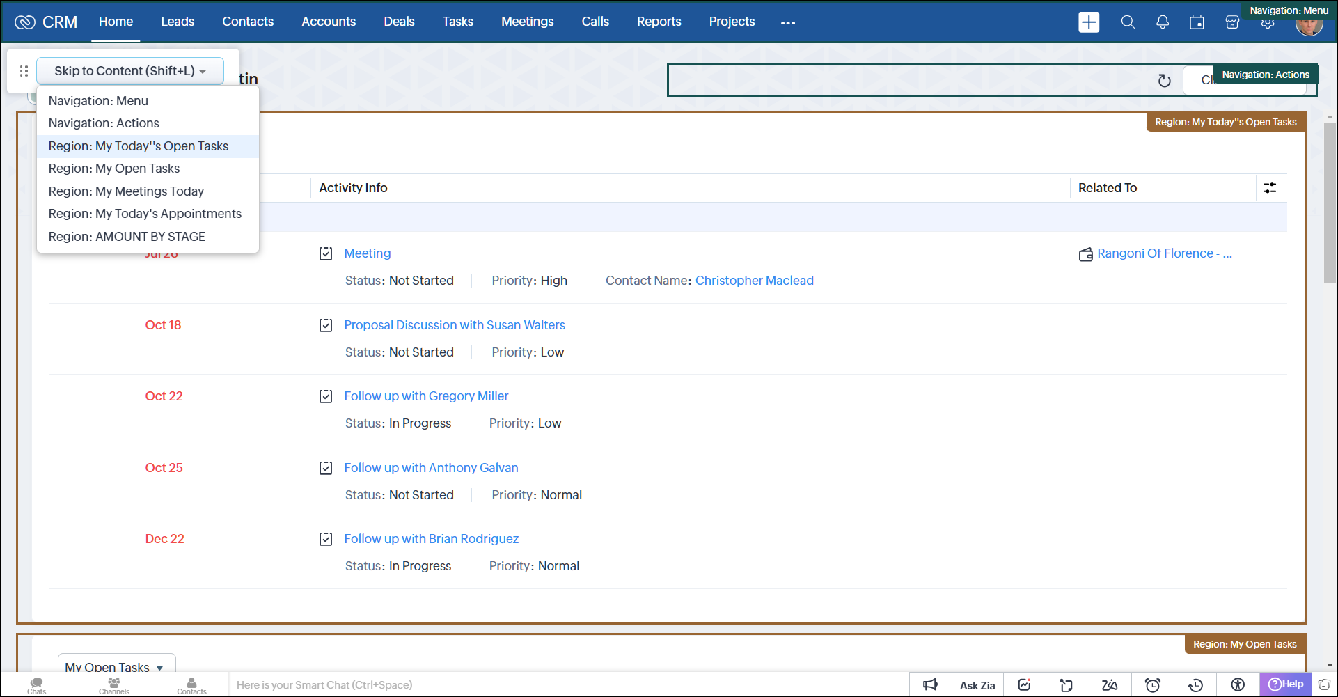 - Navighează în CRM ca de obicei; cititorul de ecran va anunța elementele și acțiunile.