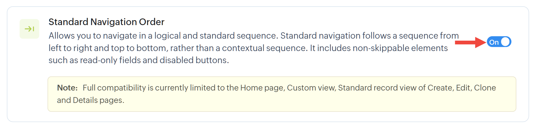 Utilizatorii pot naviga prin CRM cu tastatura și cititoarele de ecran. În astfel de cazuri, pot activa ordinea standard de navigare pentru a: