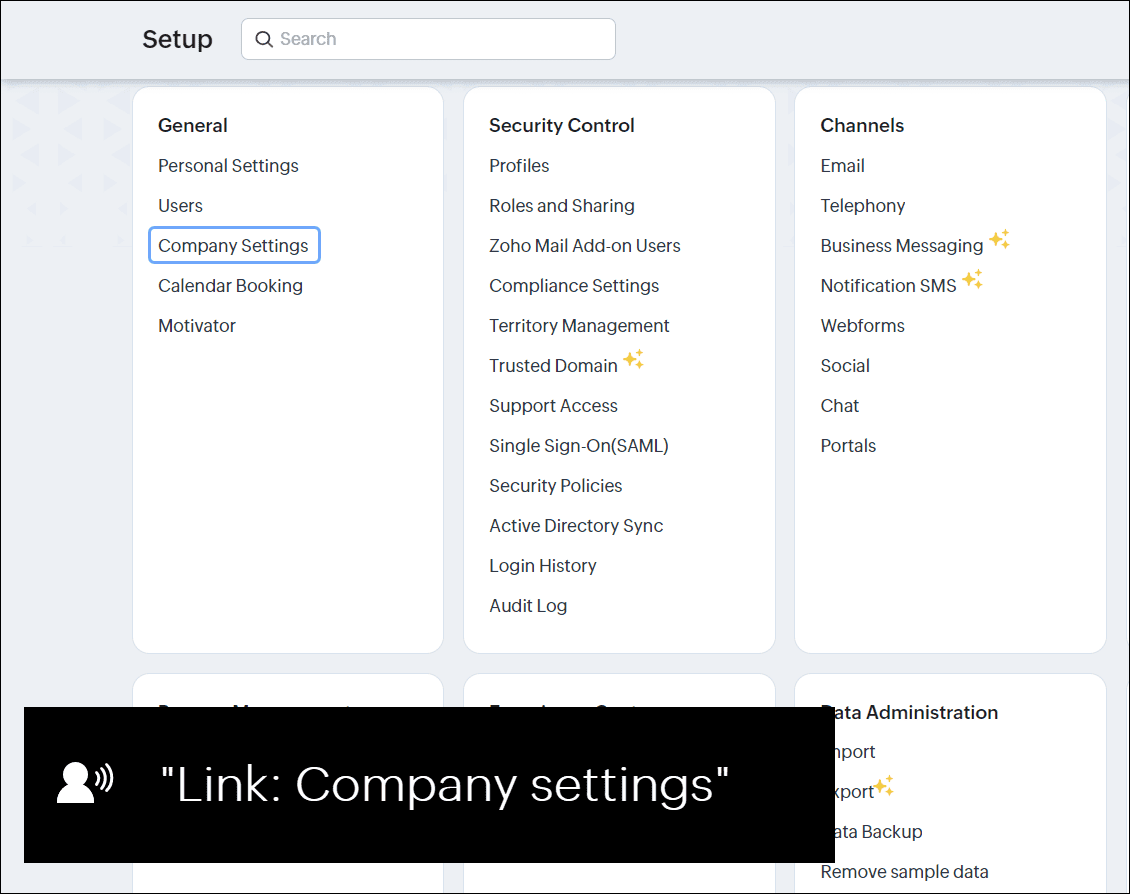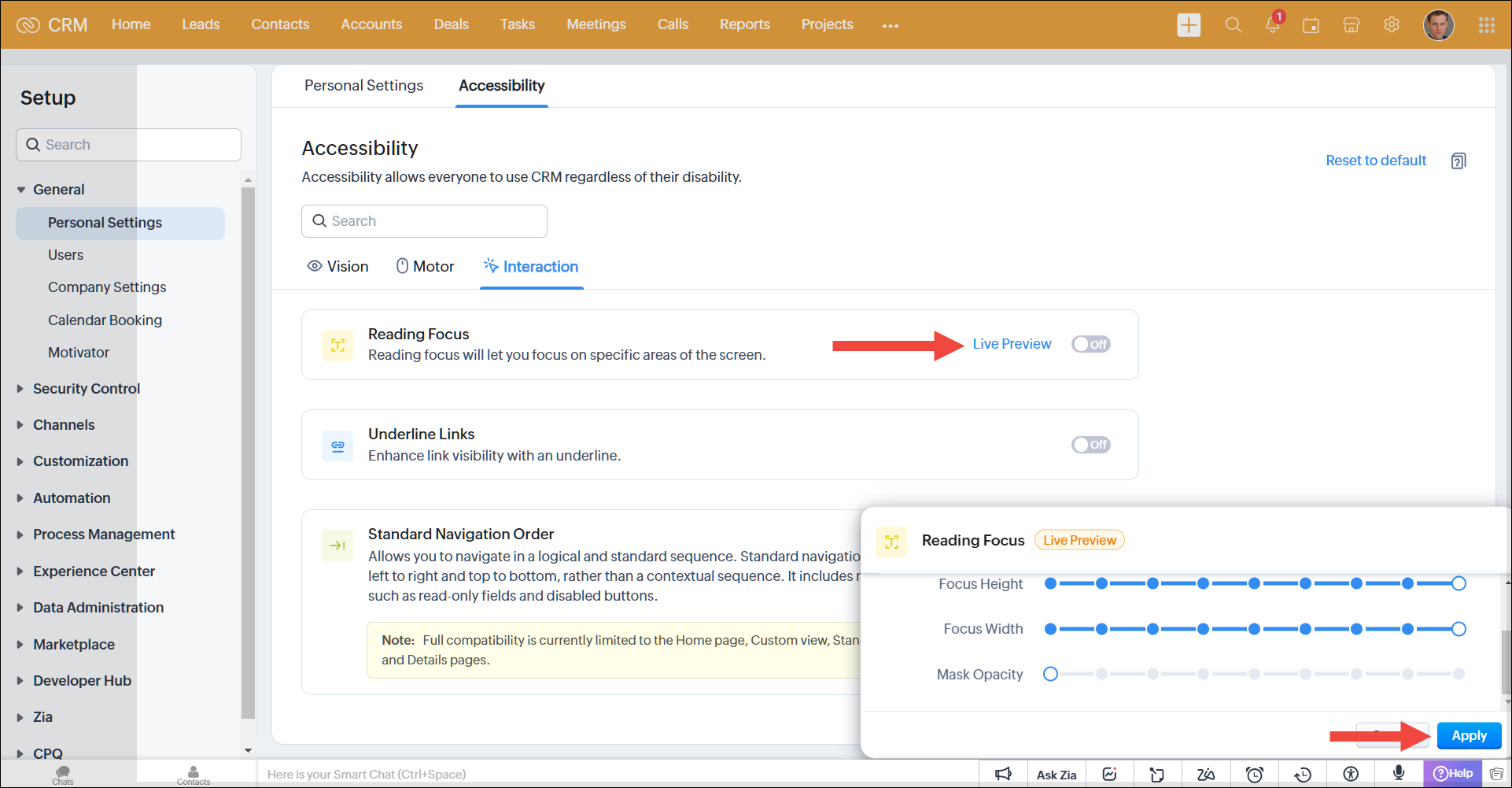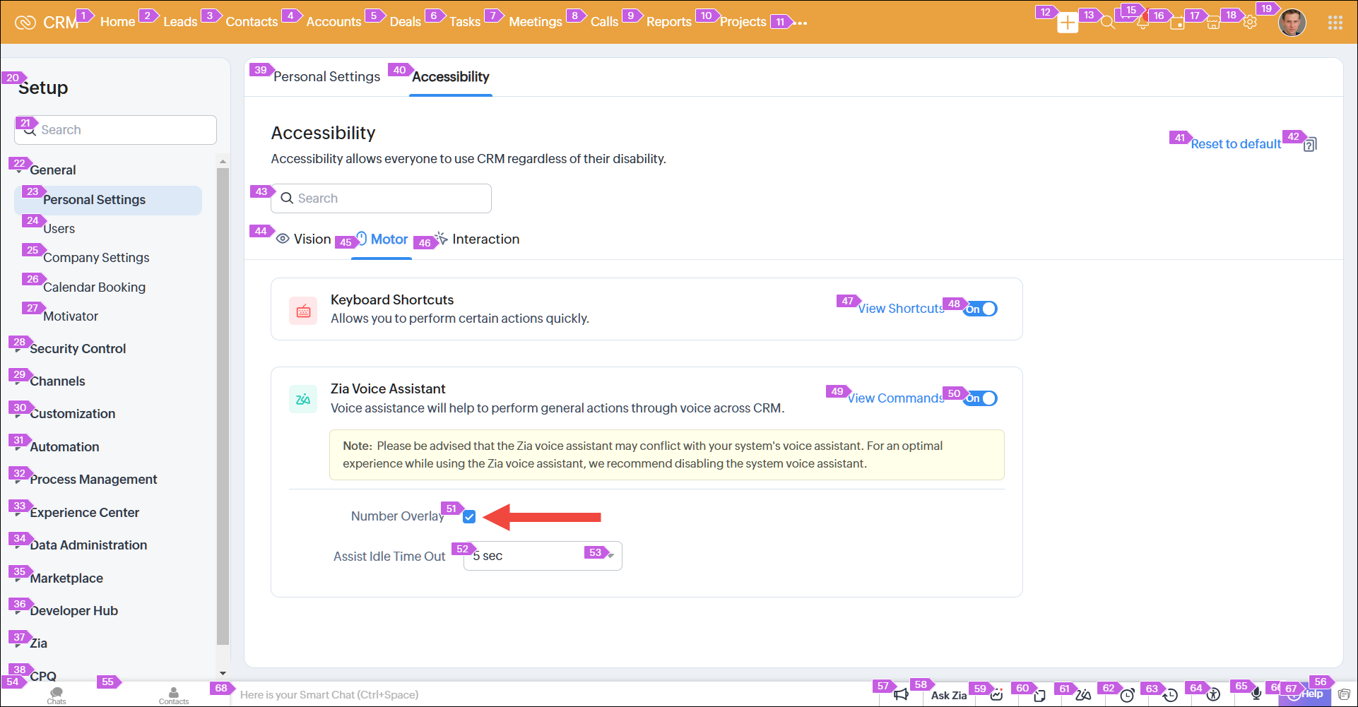 Navighează la Setup > General > Personal Settings > Accessibility. Fila Accessibility va afișa diferitele controale de accesibilitate oferite în Zoho CRM împreună cu o casetă de căutare pentru a le găsi rapid.