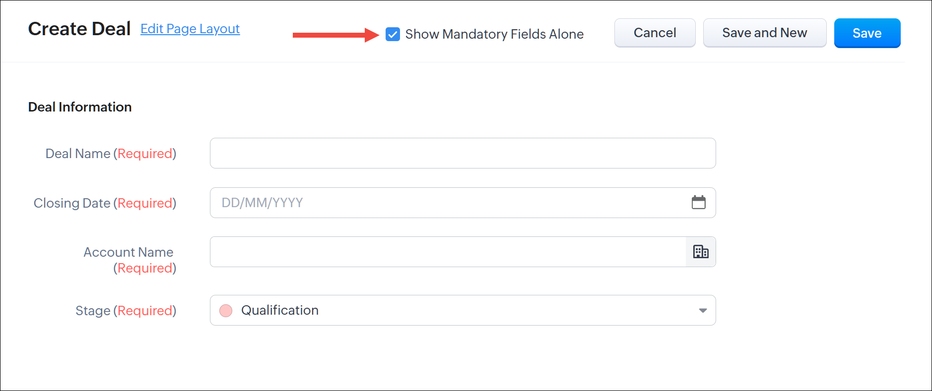 Maria beneficiază de opțiunea CRM-ului de a afișa doar câmpurile obligatorii la crearea sau editarea unei înregistrări. Acest lucru simplifică formularul și o ajută să se concentreze pe detaliile esențiale.