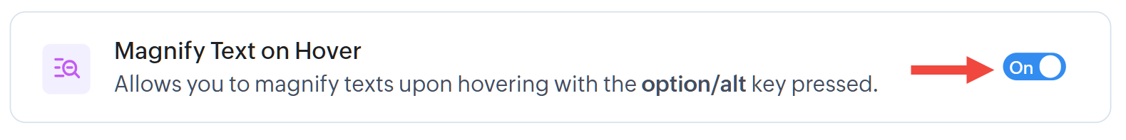 Opțiunea Mărire text la trecerea cursorului permite utilizatorilor să mărească textul greu de citit când este necesar. Acest lucru ajută utilizatorii să mărească selectiv un singur element de text când este nevoie, păstrând în același timp dimensiunea fontului și spațierea care sunt confortabile în majoritatea timpului.