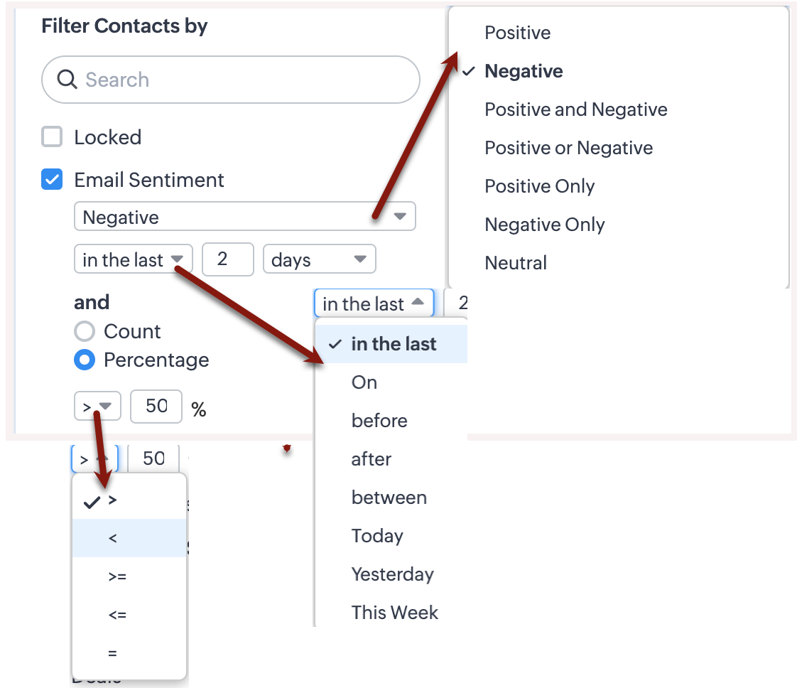 Poți folosi filtrul de sentiment al emailului pentru a obține lista tranzacțiilor care se închid în această săptămână și care au prezentat un sentiment negativ în emailurile lor și să acționezi imediat prin programarea unei sarcini sau a unui apel de urmărire. Poți filtra înregistrările și folosind sentimentul ultimului email, numărul de emailuri sau procentul de emailuri cu sentiment negativ.