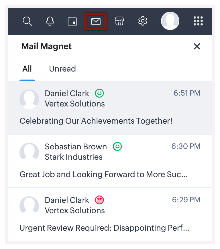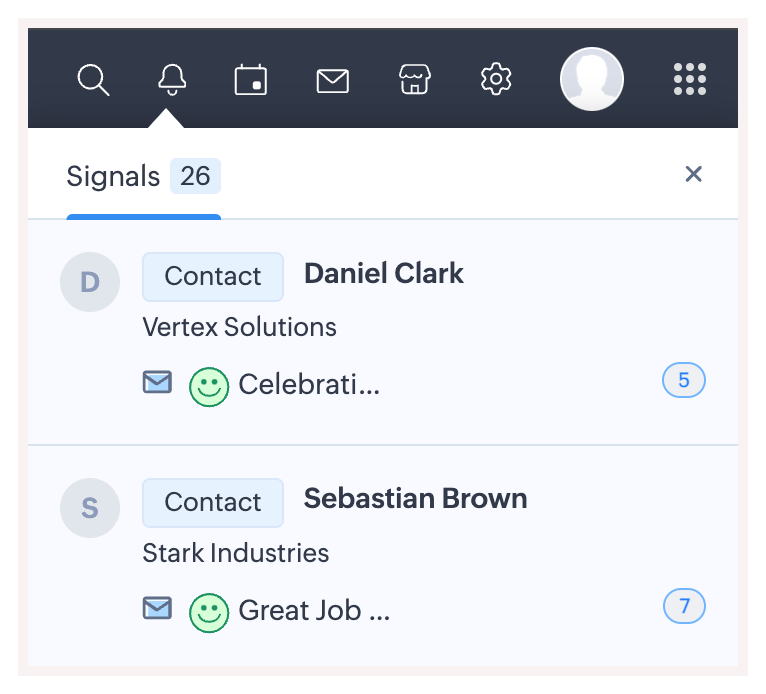 Vei putea vizualiza sentimentul emailului în notificările SalesSignal și MailMagnet. Poți acționa instantaneu asupra emailurilor direct din contul tău Zoho CRM.