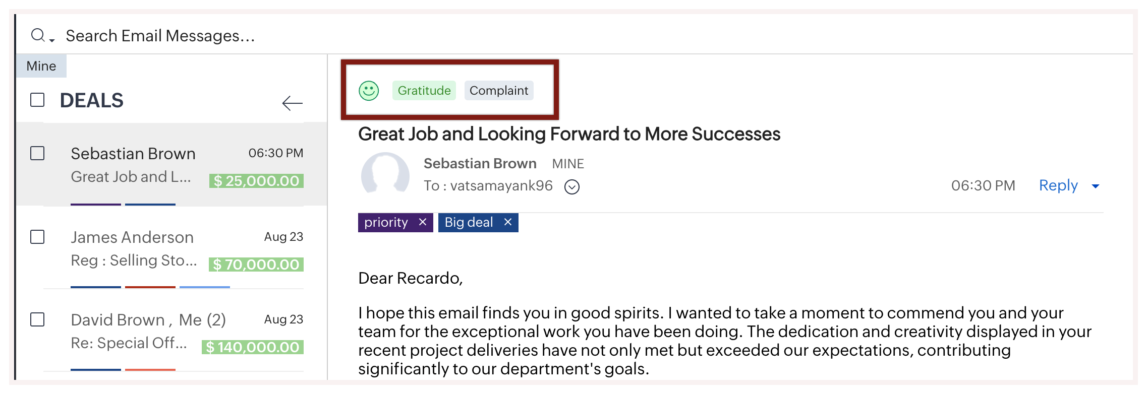 Poți folosi filtrul inteligent de sentiment al emailului pentru a obține lista contactelor care au răspuns pozitiv în ultimele săptămâni și fie să le transformi în tranzacții, fie să le urmărești pentru o discuție ulterioară.