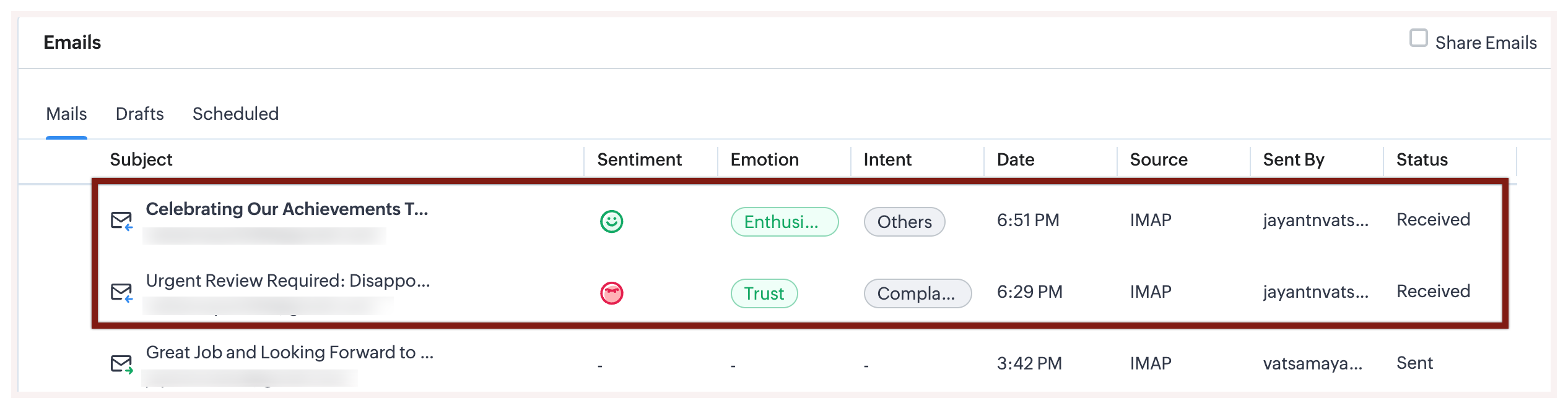 - Utilizatorii cu integrarea IMAP activată în profilul lor pot vizualiza sentimentul emailurilor