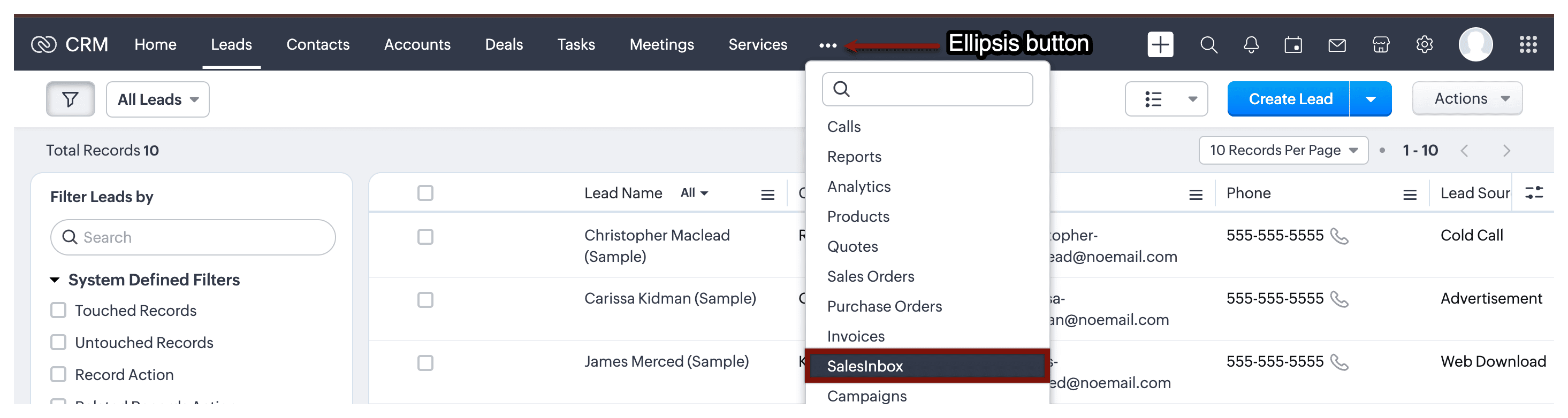 Odată activat, SalesInbox va apărea în secțiunea Module. Îl poți accesa făcând clic pe pictograma cu puncte de suspensie din bara de sus pentru a găsi SalesInbox în lista de module.