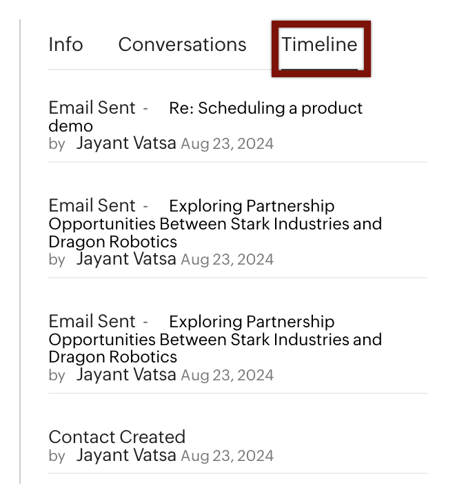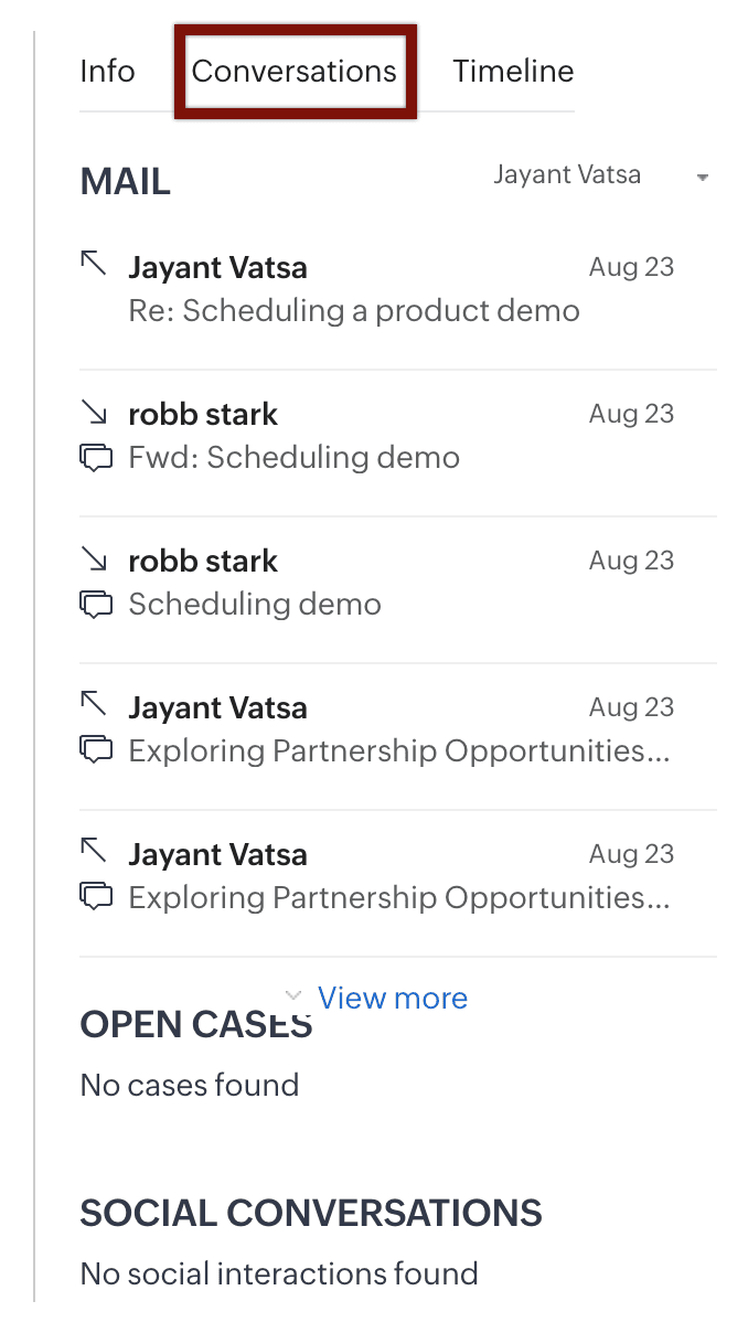 - Conversații: Conține un istoric al tuturor conversațiilor anterioare cu acel prospect/contact. Poți alege să vizualizezi doar emailurile trimise de tine sau emailurile de la toți utilizatorii din contul tău CRM.