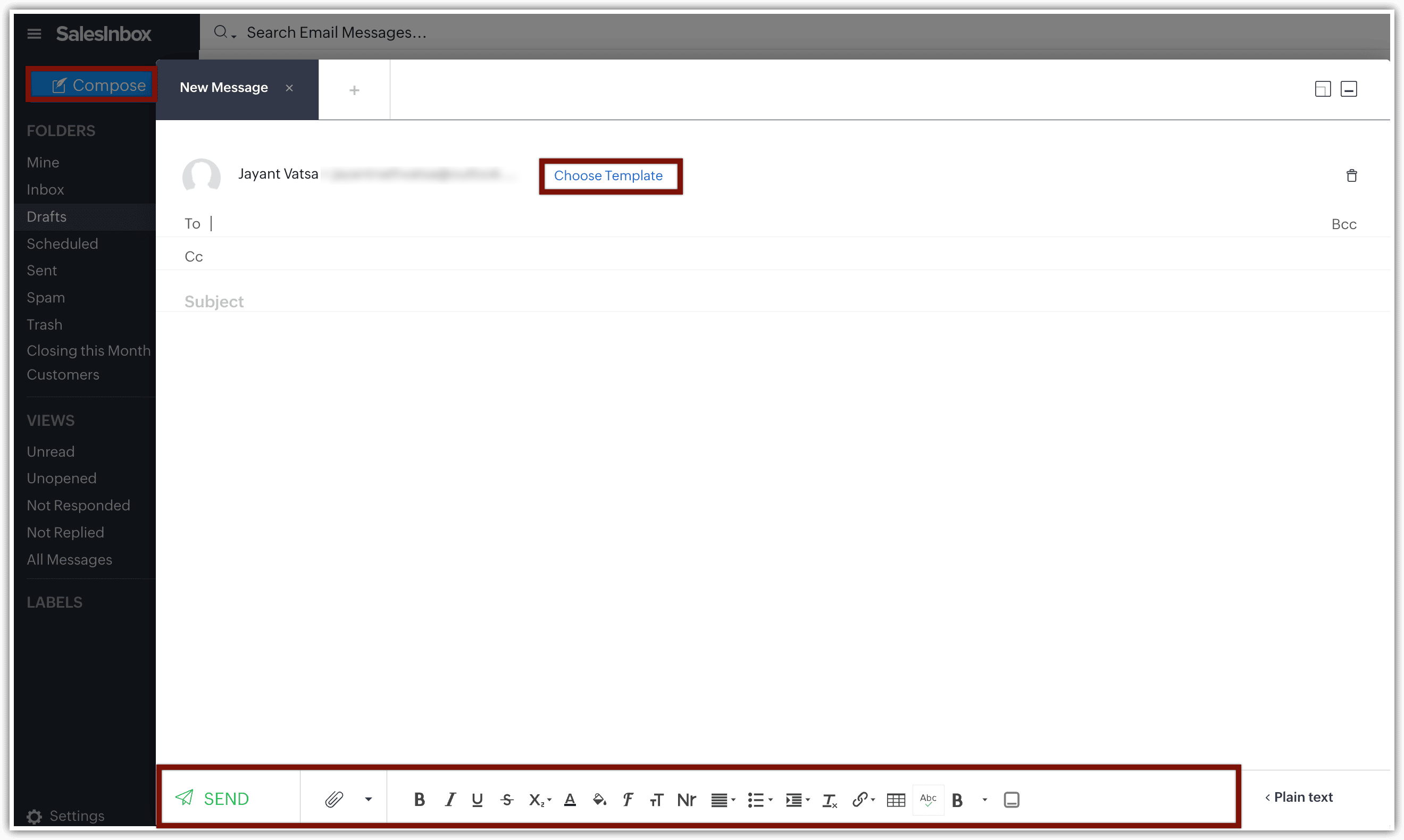 Creează un email nou în SalesInbox cu ușurință, fie redactând unul de la zero, fie selectând un șablon pre-conceput din Zoho CRM. Poți adăuga și fișiere din Google Drive, Zoho Writer, Zoho WorkDrive sau din secțiunea Documente din CRM.