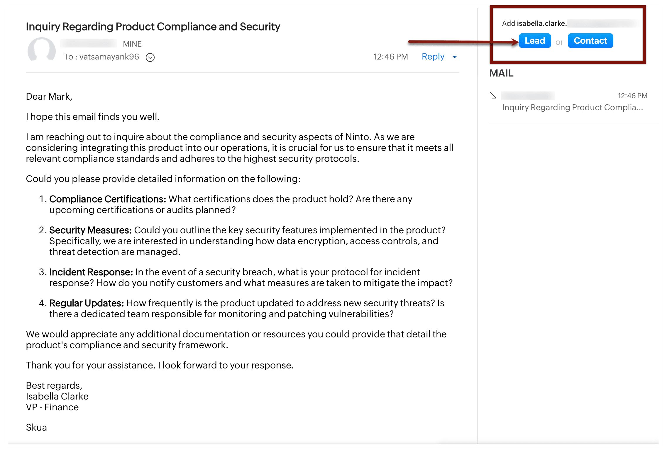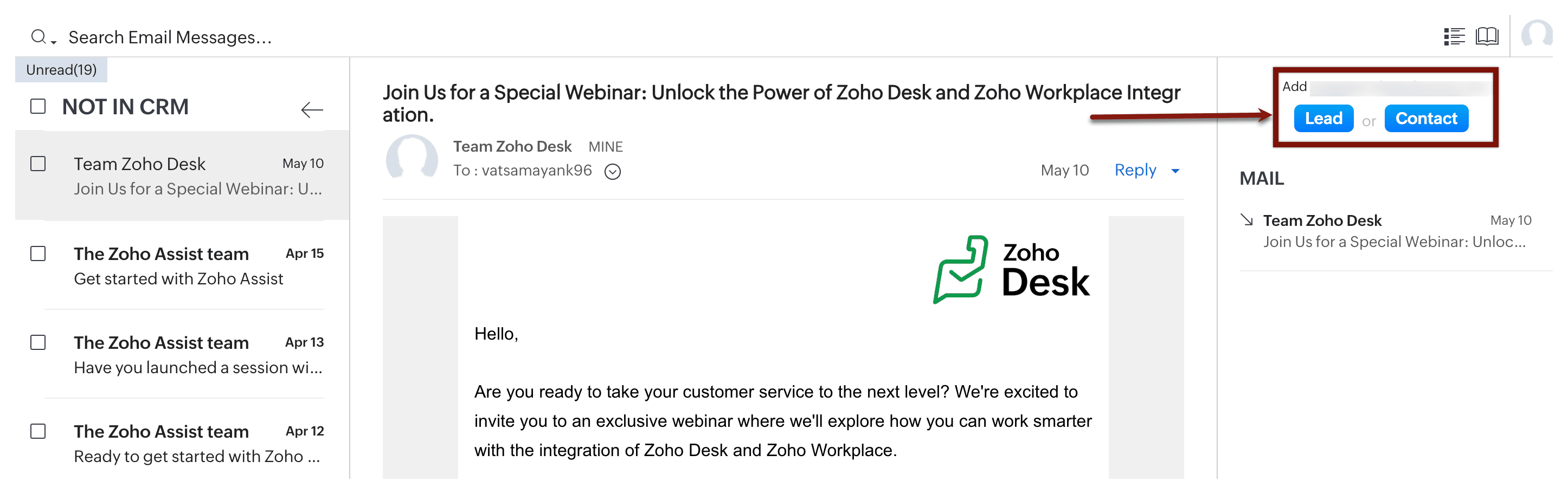 Poți crea un nou potențial, o activitate sau o notă din vizualizarea detaliată a emailului, care va fi apoi adăugată în Zoho CRM.