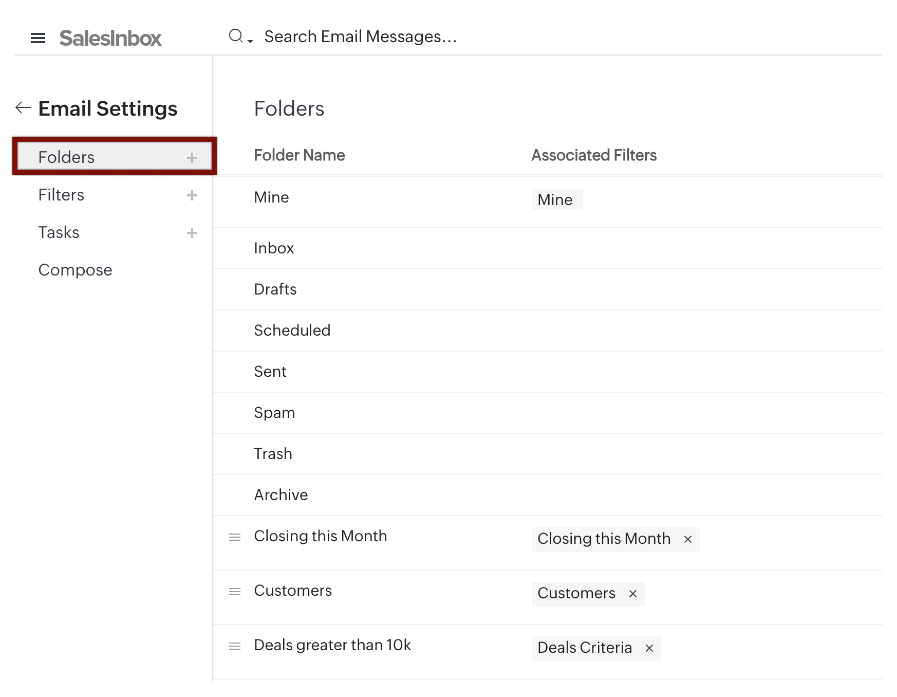 - Foldere implicite: SalesInbox vine cu foldere predefinite cum ar fi Inbox, Ciorne și Trimise, precum și foldere predefinite bazate pe CRM, cum ar fi: