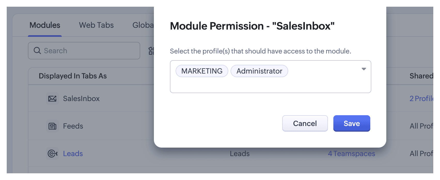 Implicit, toți utilizatorii au permisiunea de a vizualiza și accesa SalesInbox. Totuși, administratorii pot alege să acorde sau să restricționeze accesul la modulul SalesInbox pe baza tipurilor de profil și a cerințelor specifice.