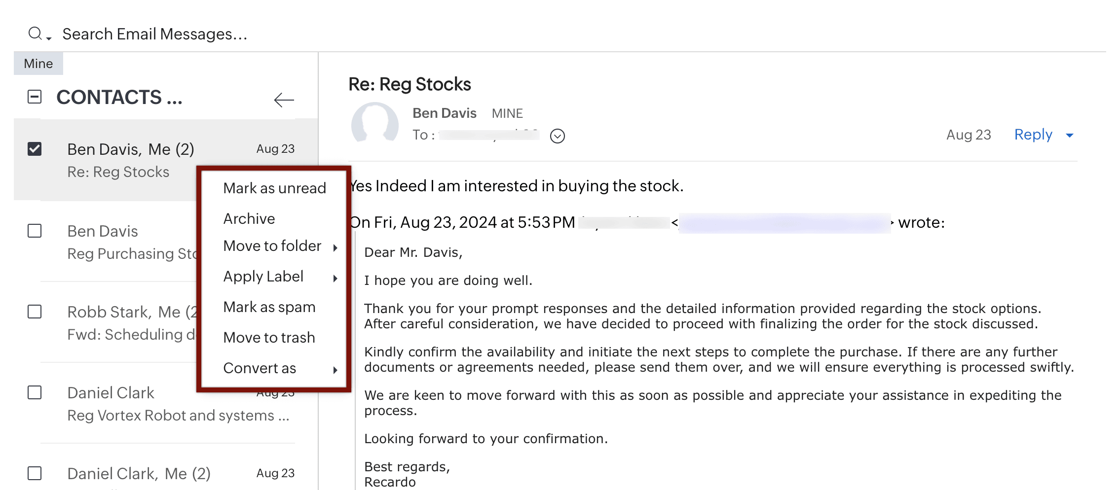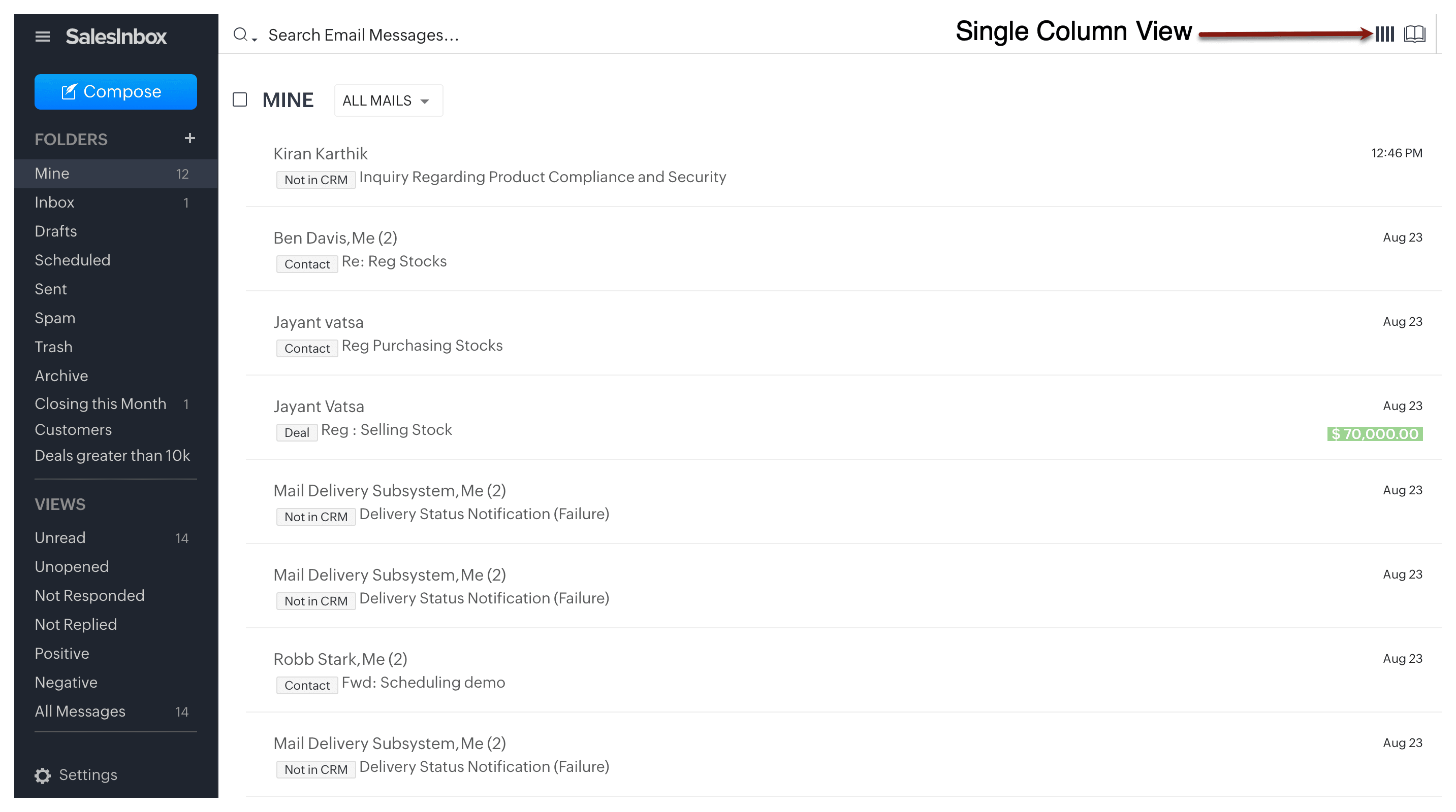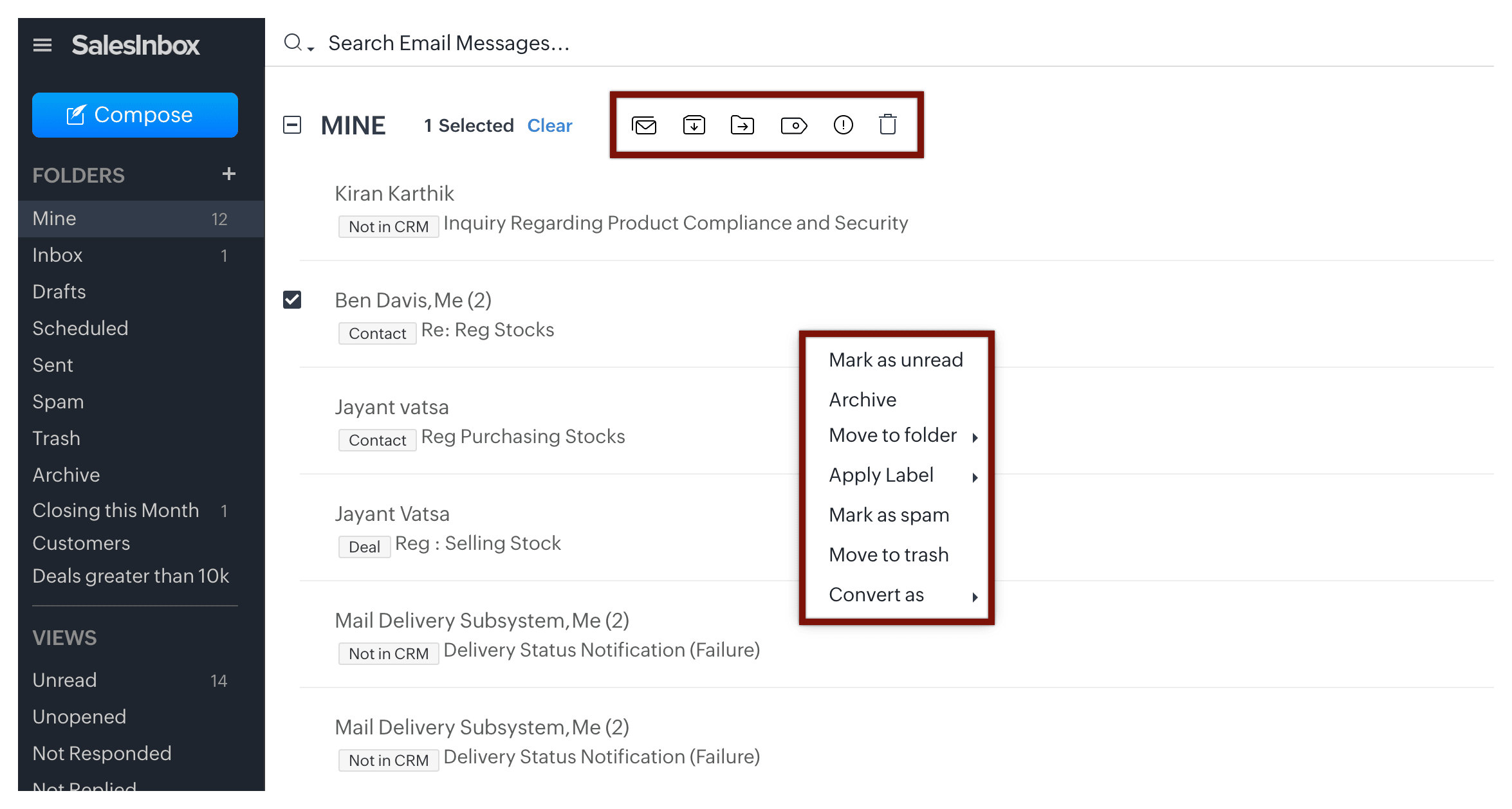 Emailurile necesită mai multe acțiuni decât simpla citire și răspuns. Este posibil să fie nevoie să efectuezi diverse acțiuni de urmărire pentru emailurile primite. SalesInbox îți permite să efectuezi multiple acțiuni din vizualizarea cu coloană unică. De exemplu, poate vrei să muți un email într-un anumit folder, să marchezi un email ca spam, să aplici o etichetă și așa mai departe.