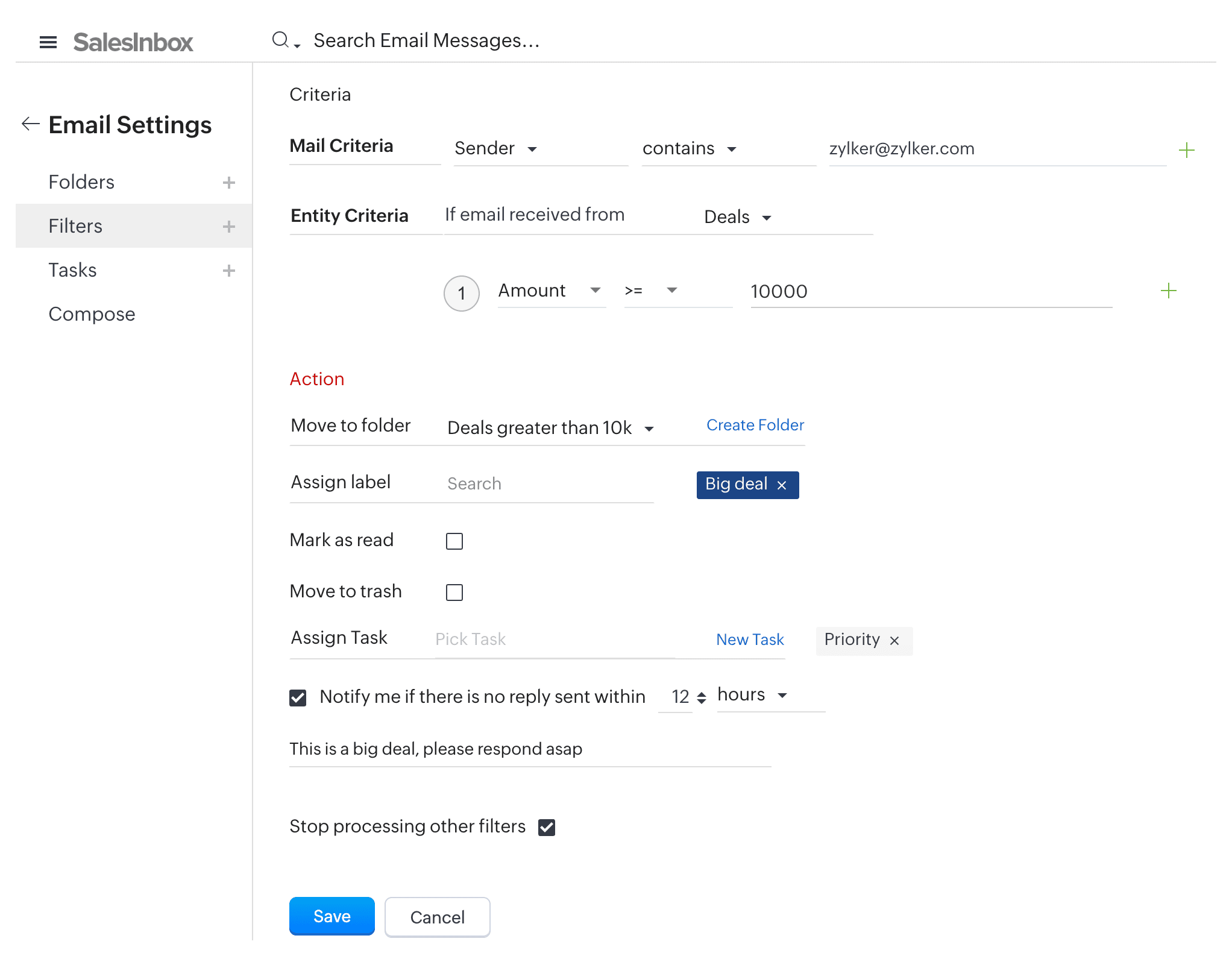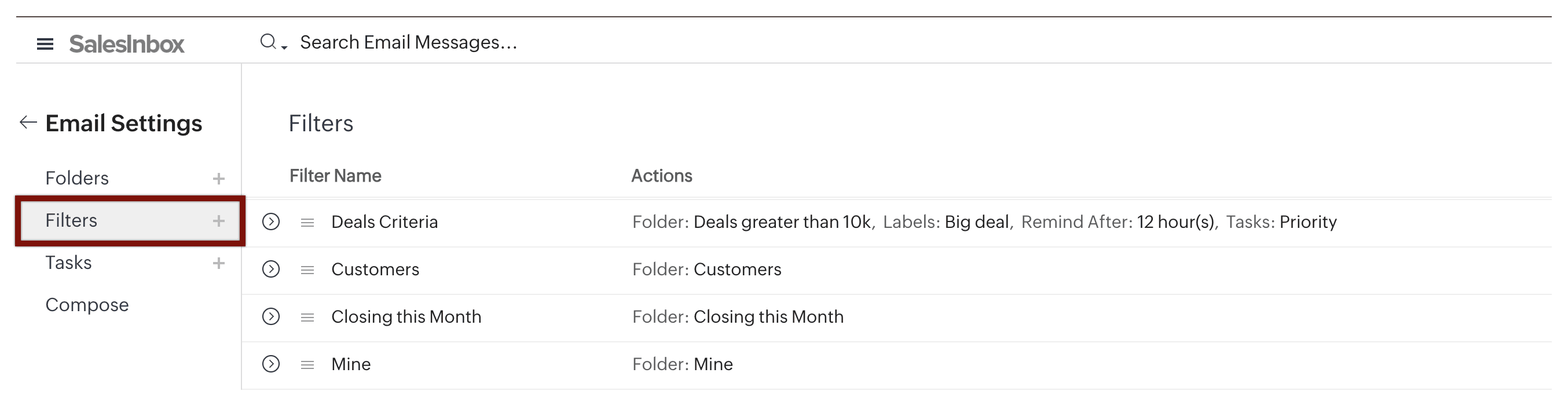 În SalesInbox, poți transfera fără probleme filtrele existente. În plus, SalesInbox îți permite să creezi filtre noi bazate pe datele CRM și criteriile entităților, permițându-ți să sortezi emailurile în foldere cu mai multă precizie. De exemplu, poți categoriza emailurile după valoarea ofertei, dimensiunea companiei sau praguri specifice de achiziție, asigurând că inbox-ul tău este organizat într-un mod care îți susține direct eforturile de vânzări. Această capacitate avansată de filtrare îmbunătățește gestionarea emailurilor, făcând din SalesInbox un instrument puternic pentru integrarea emailului tău cu datele CRM.