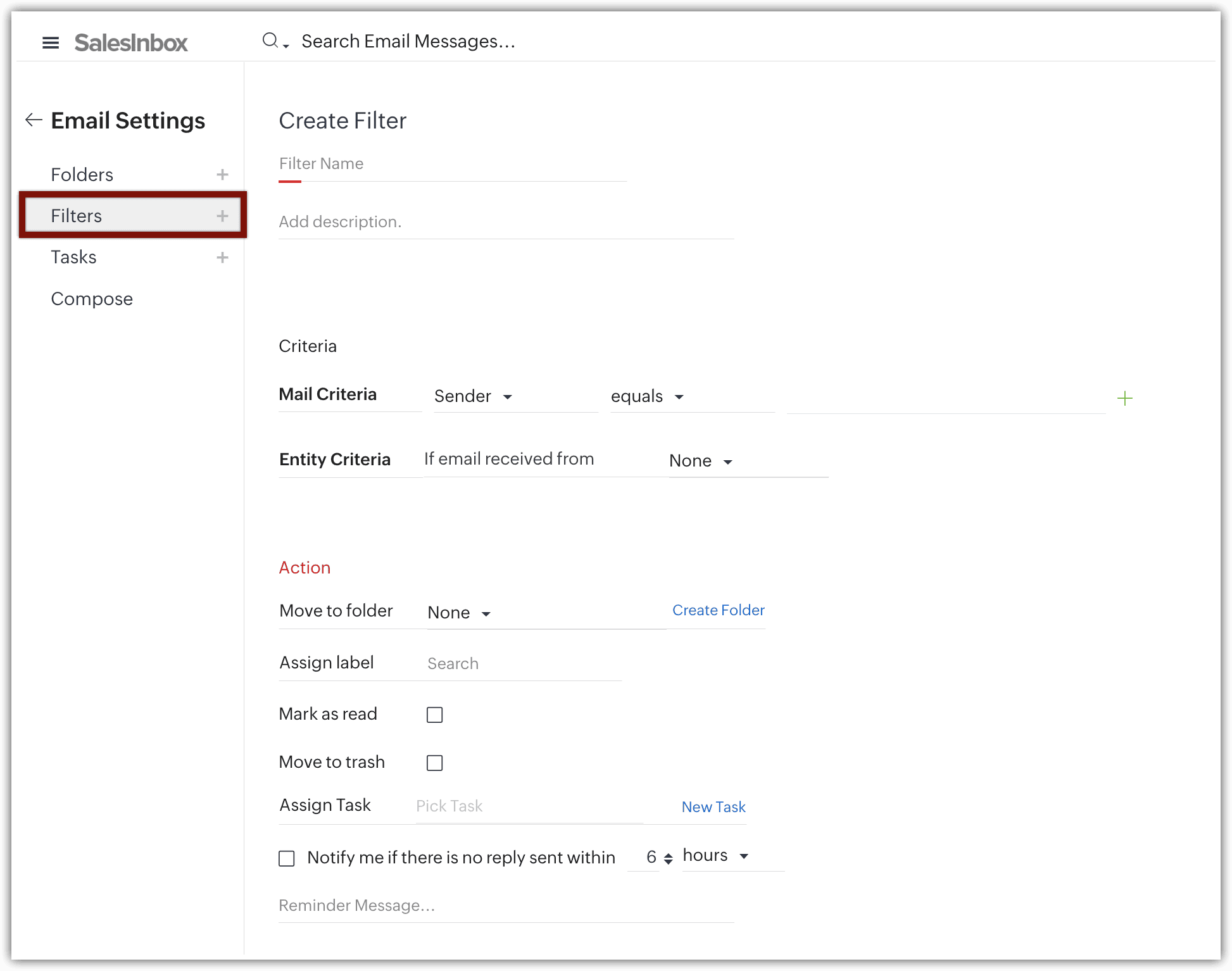 - Filtre de email personalizate: SalesInbox îți permite să imporți filtre existente sau să creezi unele noi bazate pe câmpurile și datele CRM. Această funcționalitate îți oferă flexibilitatea de a adapta organizarea emailurilor pentru a se potrivi proceselor tale specifice de vânzări.