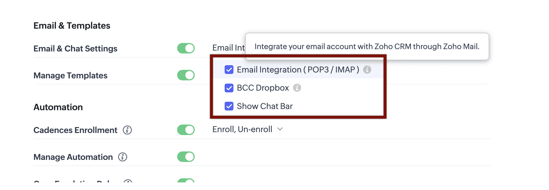 Orice utilizator, indiferent de tipul de profil, poate configura SalesInbox. Dacă Integrarea emailului este activată în Configurare > Control securitate > Profiluri > Tipuri de profil (Admin, Standard, Personalizat) > Setări Email & Chat, utilizatorii pot configura emailul lor (Gmail, Zoho Mail, Yahoo, Outlook) cu IMAP/POP3. Odată ce configurarea emailului este completă, SalesInbox va fi activat automat pentru utilizatori.