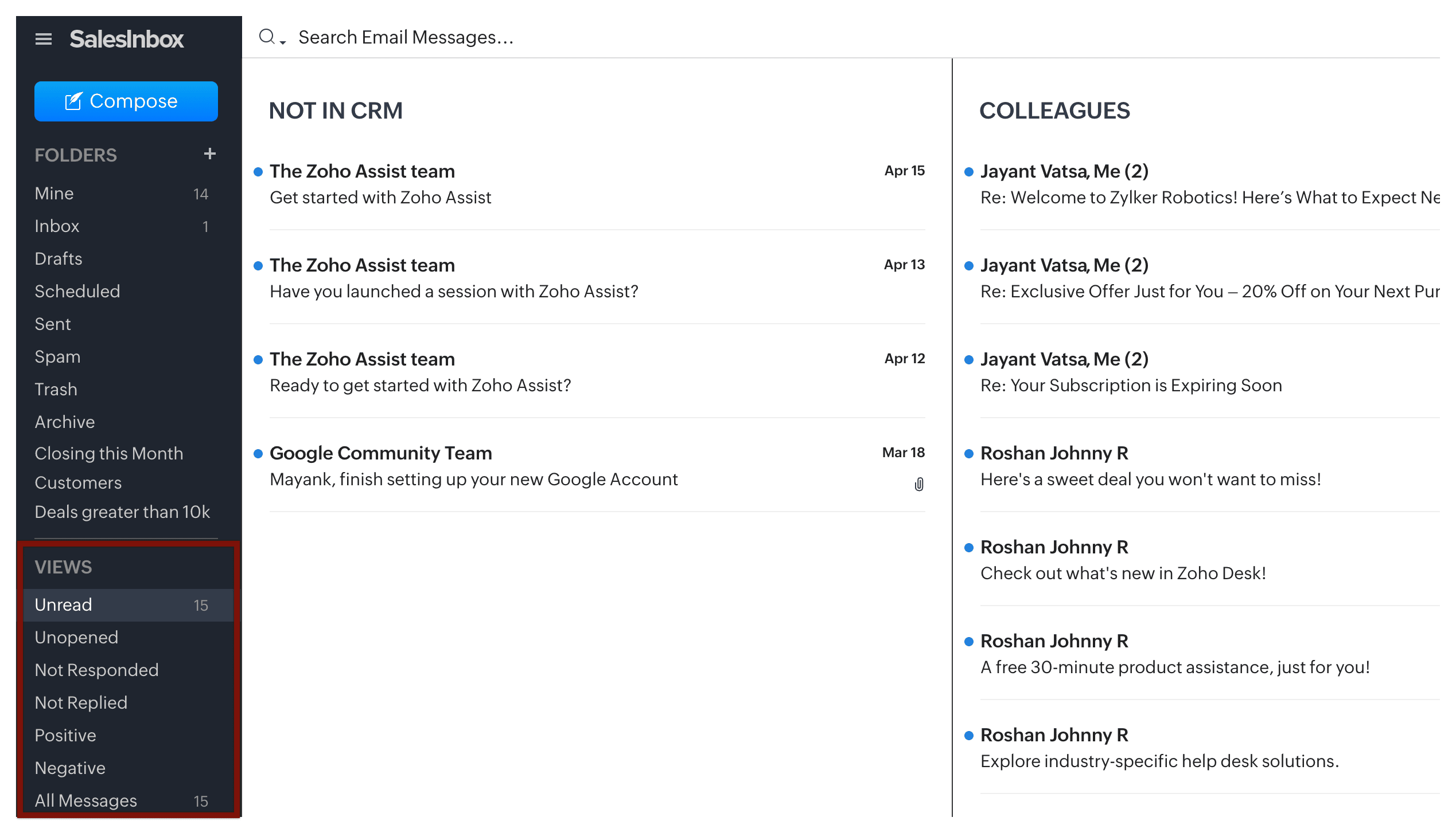 Secțiunea Vizualizări emailuri din Zoho SalesInbox afișează emailurile pe baza statisticilor despre emailuri. Folosirea acestei secțiuni te va ajuta să urmărești emailurile către și de la clienți.