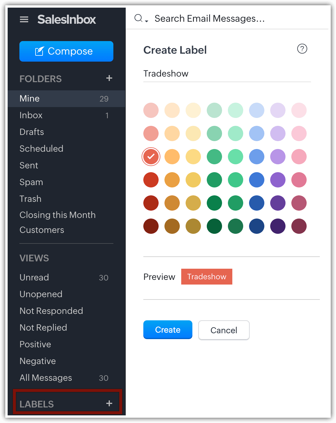 - Stocare organizată a emailurilor: SalesInbox îți permite să creezi foldere și etichete noi, permițând un sistem de gestionare a emailurilor mai personalizat și mai organizat. Această funcționalitate te ajută să categorizezi și să regăsești cu ușurință emailurile importante.