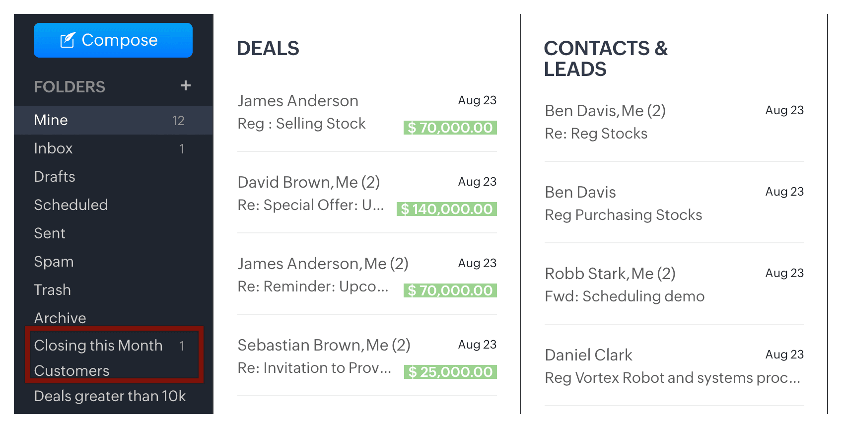 - Clienți: Acest folder afișează emailurile de la contacte cu care toate ofertele sunt „Câștigate și închise".