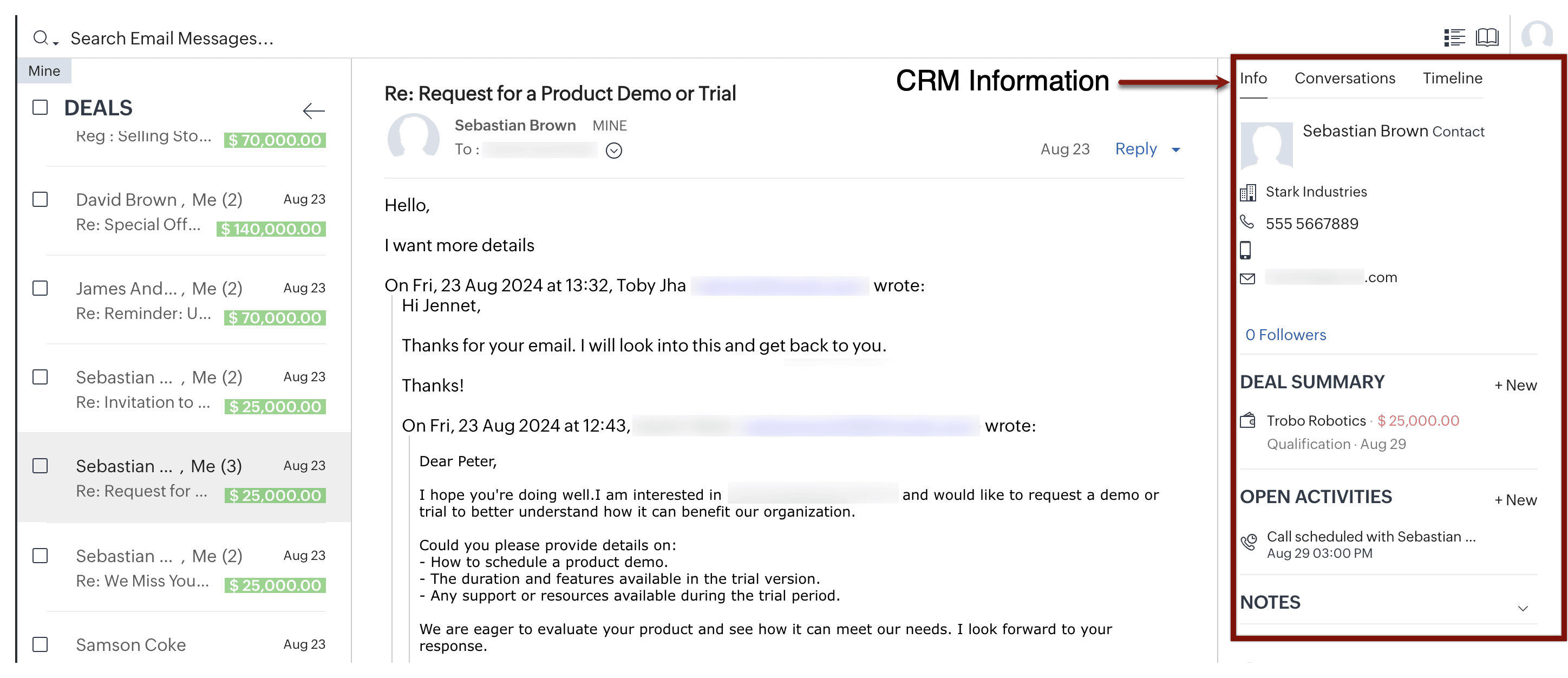 Panoul din dreapta în vizualizarea detaliată a emailului oferă o prezentare generală cuprinzătoare a informațiilor contactului, inclusiv conversațiile anterioare, ofertele asociate și cronologiile activităților; panoul de detalii prezintă următoarele secțiuni: - Informații: Conține informații de contact ale expeditorului. Poți vizualiza și o listă a tuturor ofertelor asociate cu acea adresă și poți crea una nouă dacă este necesar. Activitățile pot fi, de asemenea, vizualizate sau create din nou, iar notele pot fi luate.