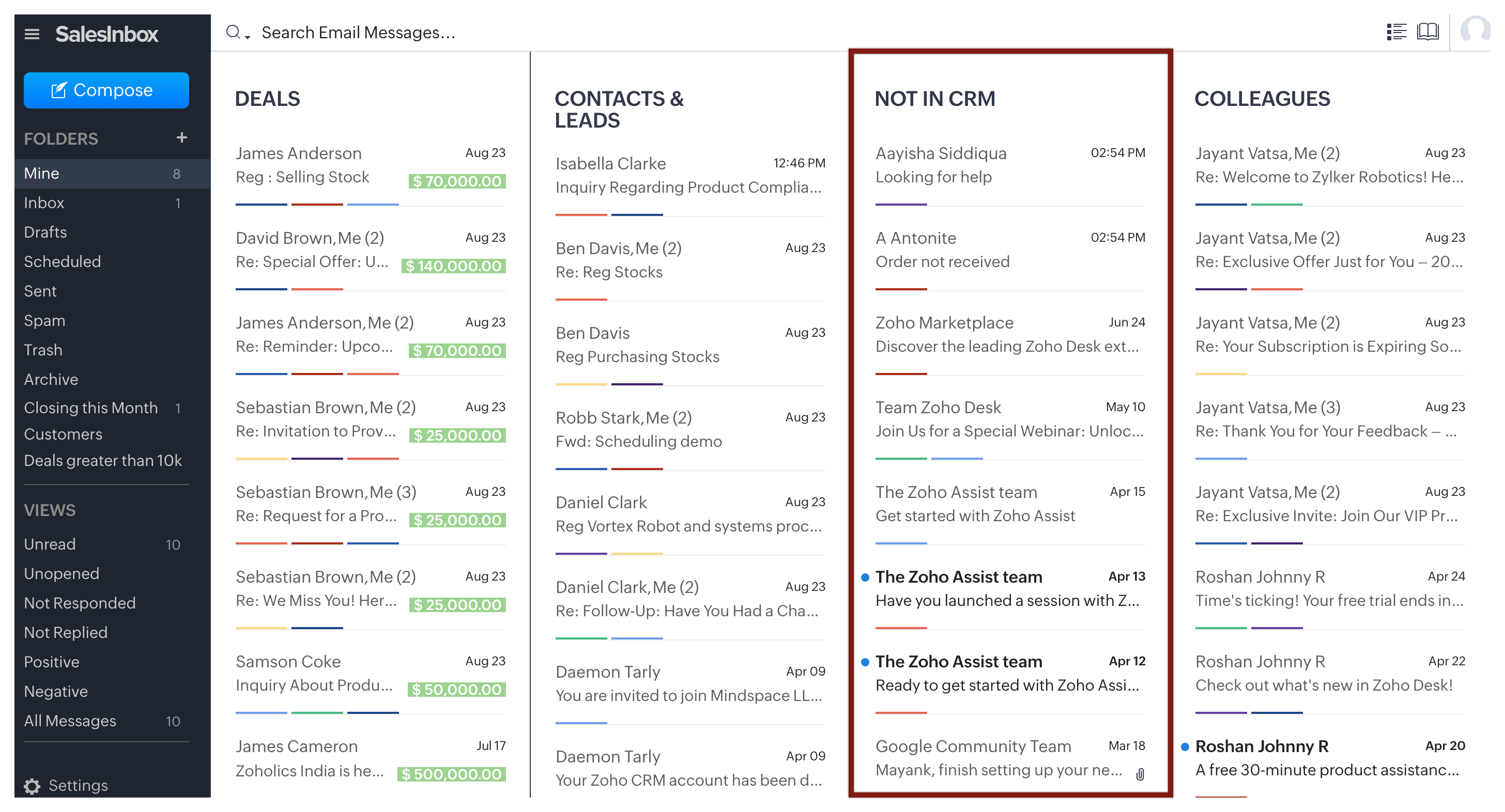 - Gestionare eficientă a emailurilor: Vizualizările implicite din SalesInbox sunt organizate pe baza stării emailurilor, cum ar fi Necitite, Nedeschise, Fără răspuns, Fără reacție și Toate mesajele. Spre deosebire de majoritatea clienților de email, oferim vizualizări bazate pe sentimentele emailurilor, cum ar fi Pozitive și Negative, oferind informații despre dacă rezoluția ta este suficientă și ce clienți să prioritizezi în funcție de sentimentele din emailuri. Această configurare te ajută să rămâi la curent cu comunicările importante și să-ți gestionezi mai eficient inbox-ul.
