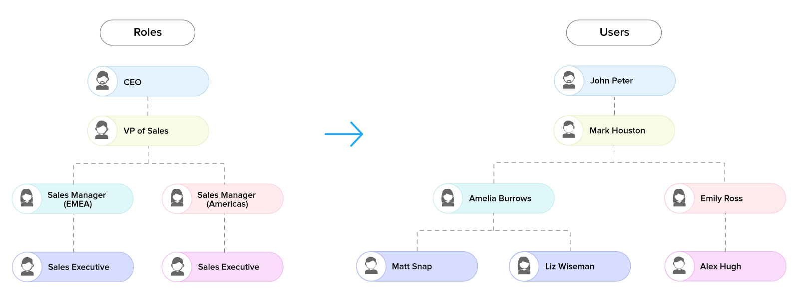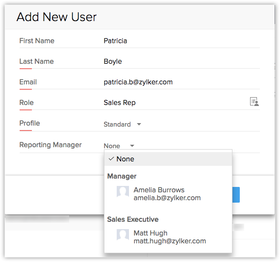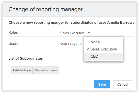 Exemplu: John Peters, CEO-ul Zylker Inc., are rolul administrativ și poate accesa datele întregii organizații. Sub el se află doi manageri de vânzări, Amelia Burrows și Emily Ross. Conform ierarhiei organizaționale a Zylker, executivii de vânzări raportează managerilor de vânzări, astfel încât fiecare manager va avea executivi de vânzări sub ea și va avea acces la datele lor. VP-ul de vânzări, Mark Houston, este membrul fără raportare din organizație, iar datele sale vor fi accesibile lui John Peters.