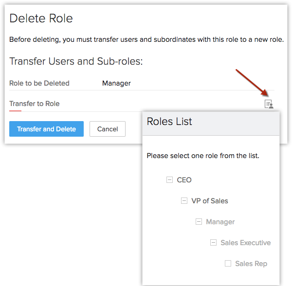 - În pagina Delete Role, sub Transfer Users and Sub-roles apasă pe iconița listei de roluri din Transfer to Role.