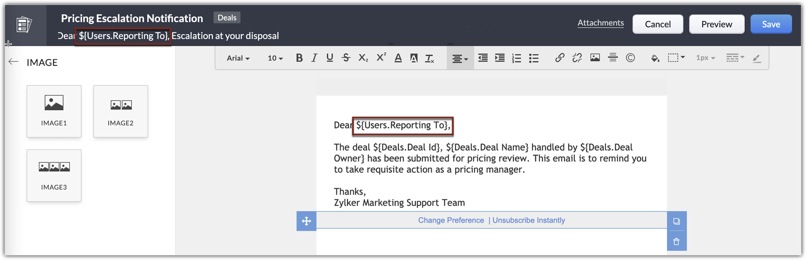 Zoho CRM îți permite să creezi seturi de acțiuni care te ajută să automatizezi activitățile de vânzări și marketing. Poți asocia aceste acțiuni cu reguli de workflow, blueprints și procese de aprobare. Una dintre acțiunile care poate fi asociată direct cu ierarhia de raportare este trimiterea alertelor. Poți asocia o alertă cu o regulă de workflow, astfel încât email-ul selectat să fie trimis automat destinatarilor atunci când regula este declanșată. În ierarhia de raportare, poți alege managerul de raportare al proprietarului înregistrării ca unul dintre destinatarii email-ului.