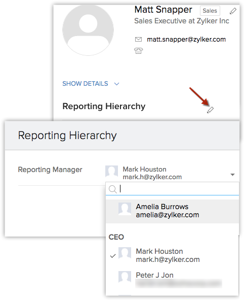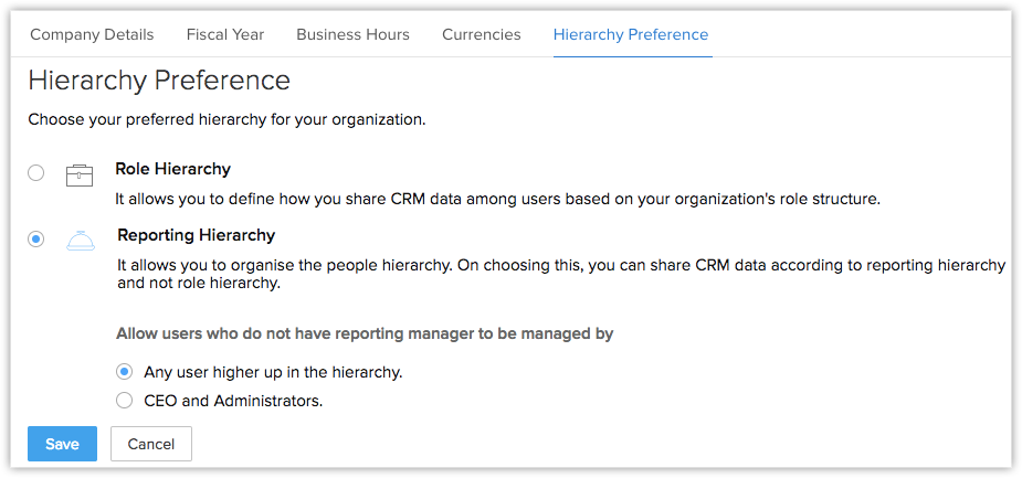 Zoho CRM îți permite să vizualizezi detaliile de raportare ale unui utilizator cu un singur clic. Informațiile utilizatorului vor afișa managerul de raportare al utilizatorului, precum și subordonații (dacă este cazul). Aceste date nu vor fi vizibile dacă preferința de ierarhie este schimbată sau dezactivată. În plus, datele unui utilizator fără raportare nu vor fi afișate.