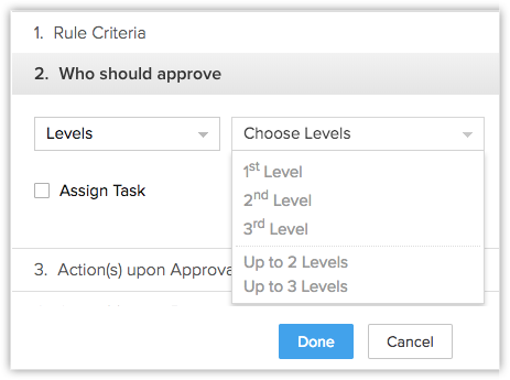 - Când configurezi Who Should Approve, poți selecta Levels pentru a defini dacă sarcina trebuie aprobată la primul, al doilea sau al treilea nivel al ierarhiei. Poți alege, de asemenea, dacă toți membrii până la al doilea sau al treilea nivel al ierarhiei sunt necesari pentru aprobare.
