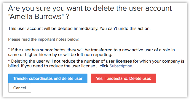 Ca admin, poți șterge utilizatori din contul CRM. Există două condiții de care trebuie să fii conștient când ștergi un utilizator: