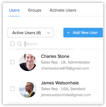 - Administratori: Utilizatori care pot accesa întregul sistem. Trebuie să existe cel puțin un Administrator pentru a accesa toate datele și funcționalitățile din contul tău Zoho CRM. Exemplu: CEO sau oficiali de top sau conducere superioară.