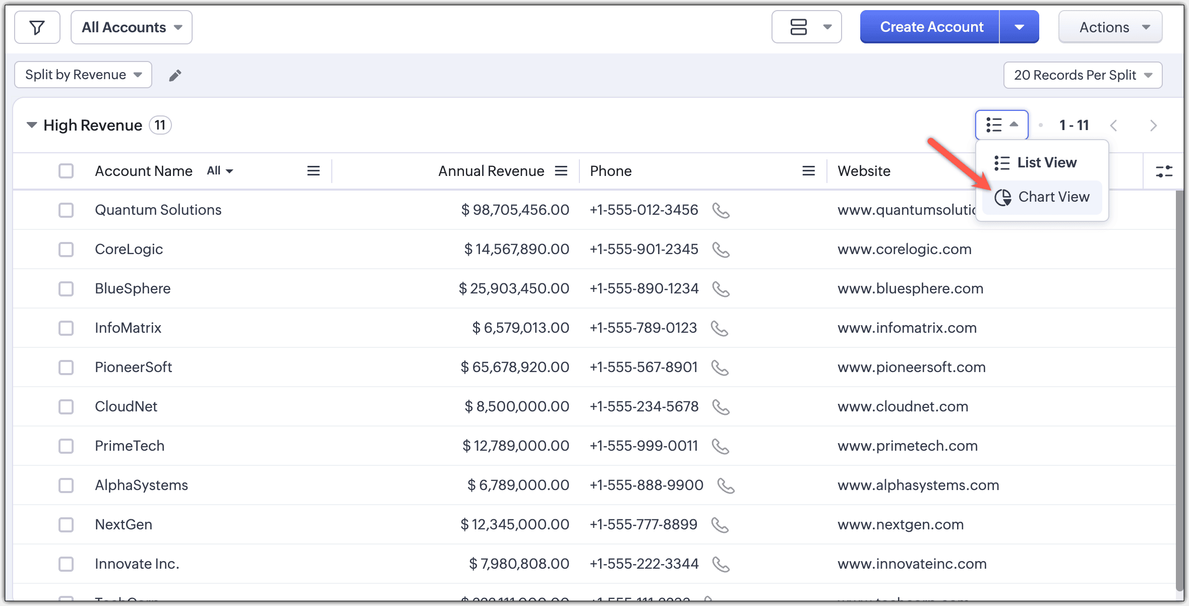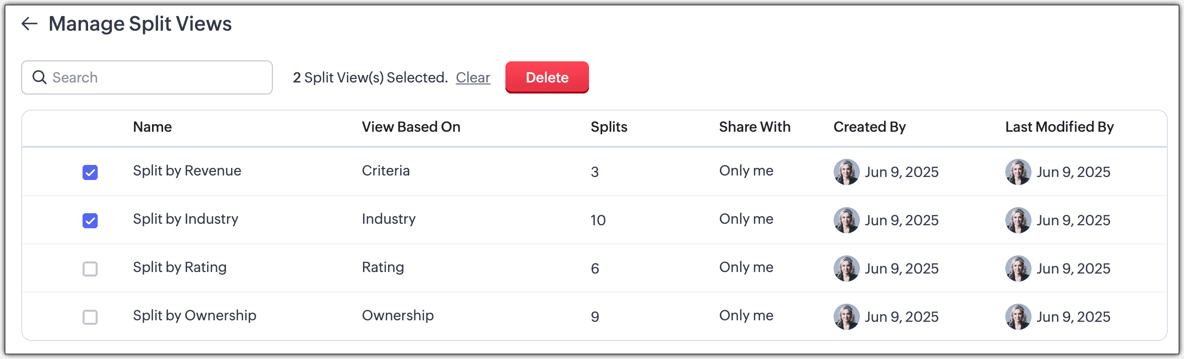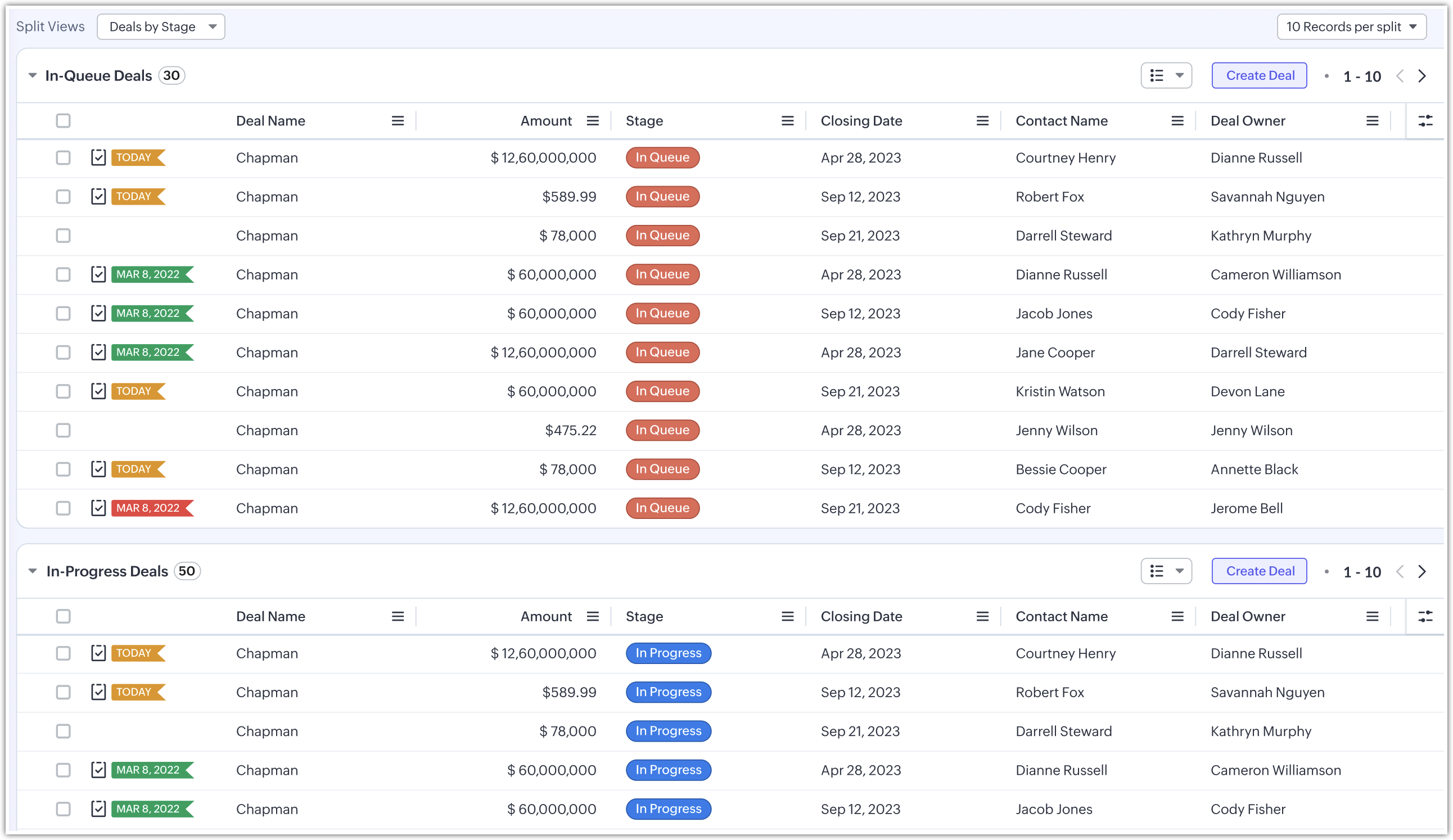 Split View este disponibil pentru modulele care acceptă vizualizări de tip listă în interfața NextGen UI a Zoho CRM, inclusiv: