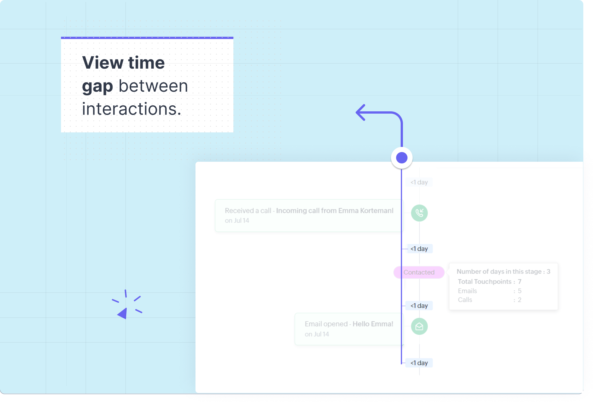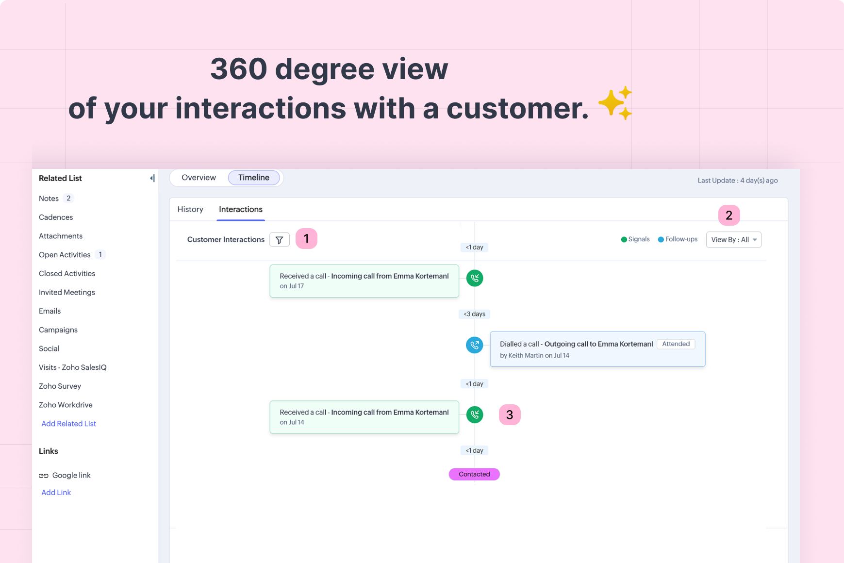 În Zoho CRM, aceștia pot obține acces la acest parcurs consultând tab-ul Interactions al unui lead sau contact specific. Tab-ul Interactions este o vizualizare cuprinzătoare a punctelor de contact ale clienților pe diverse canale, prezentate în ordine cronologică.