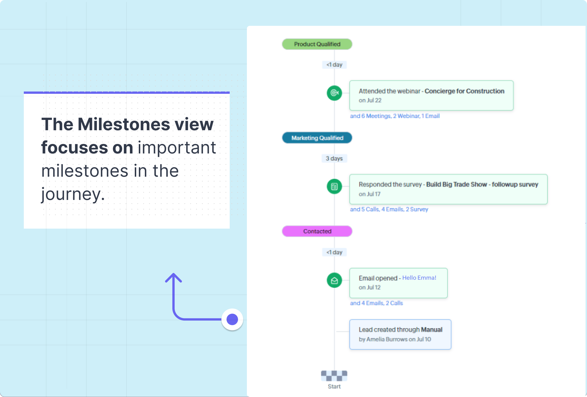 În lumea interacțiunilor cu clienții, unde fiecare parcurs este distinct, nevoia de interacțiune omni-canal fără întreruperi este esențială. Pentru a oferi acest lucru, echipele tale care interacționează cu clienții au nevoie de acces facil la parcursul complet al clientului — o serie de interacțiuni între clienți și organizația ta. Aceste detalii vitale ale parcursului se află în CRM-ul tău, adesea dispersate printre intrările din cronologia unui lead sau contact.