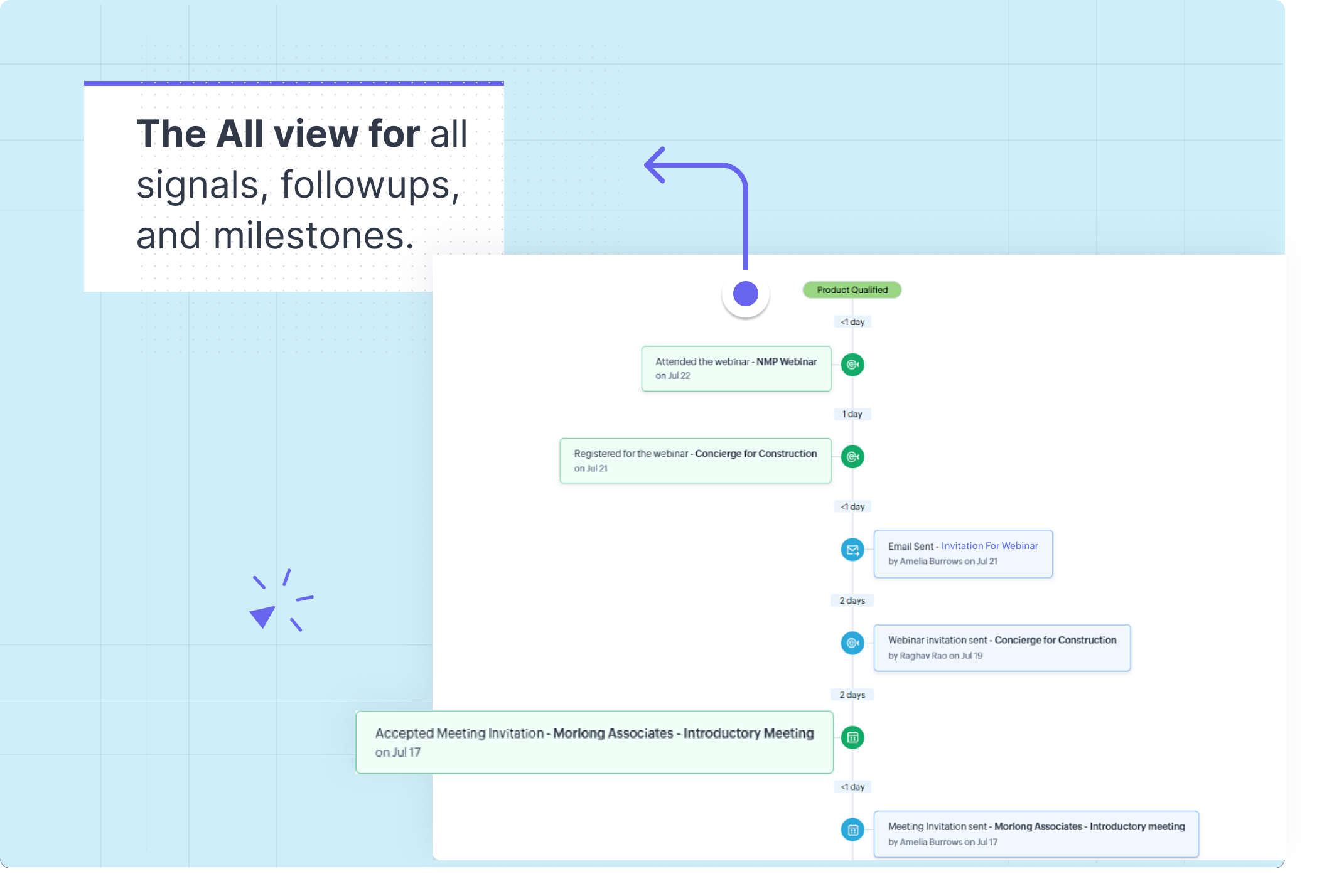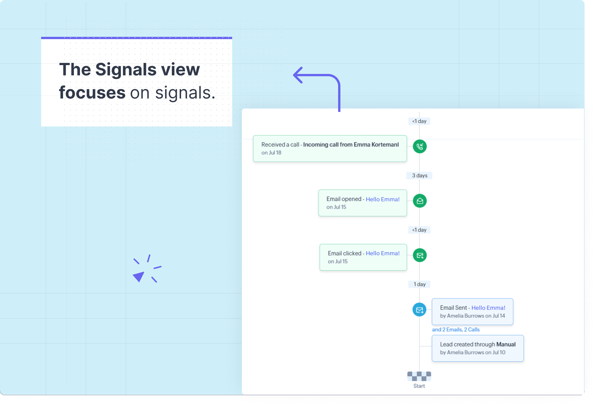 - Signals: Această vizualizare se va concentra pe semnalele emise de client. Ultimul follow-up dinaintea fiecărui semnal este afișat, în timp ce restul sunt restrânse pentru a te ajuta să te concentrezi mai mult pe semnalele primite de la clienți.