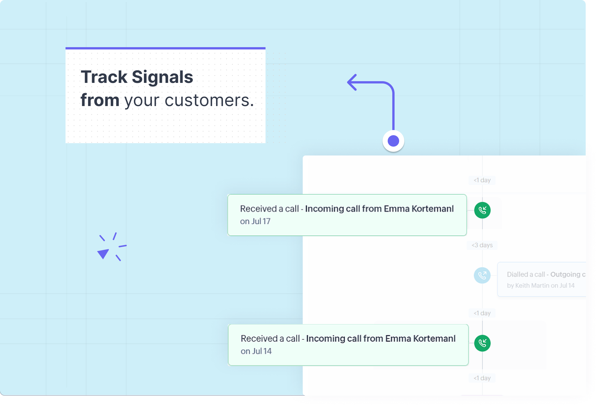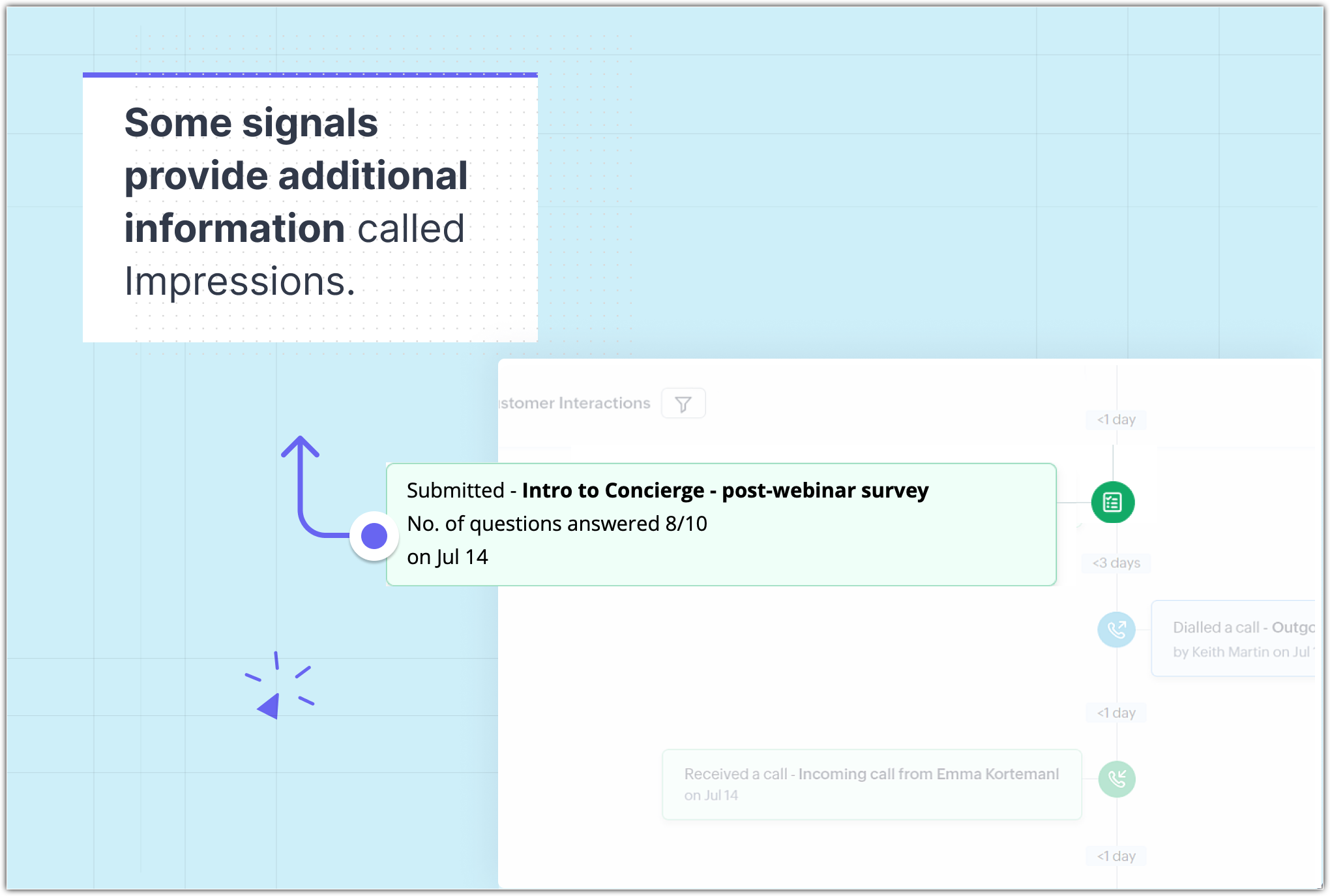 Acestea sunt furnizate de client prin multiple medii. Exemplele includ deschiderea unui email, efectuarea unui apel, vizitarea unui site web și altele. Semnalele sunt prezente în partea stângă a traseului.