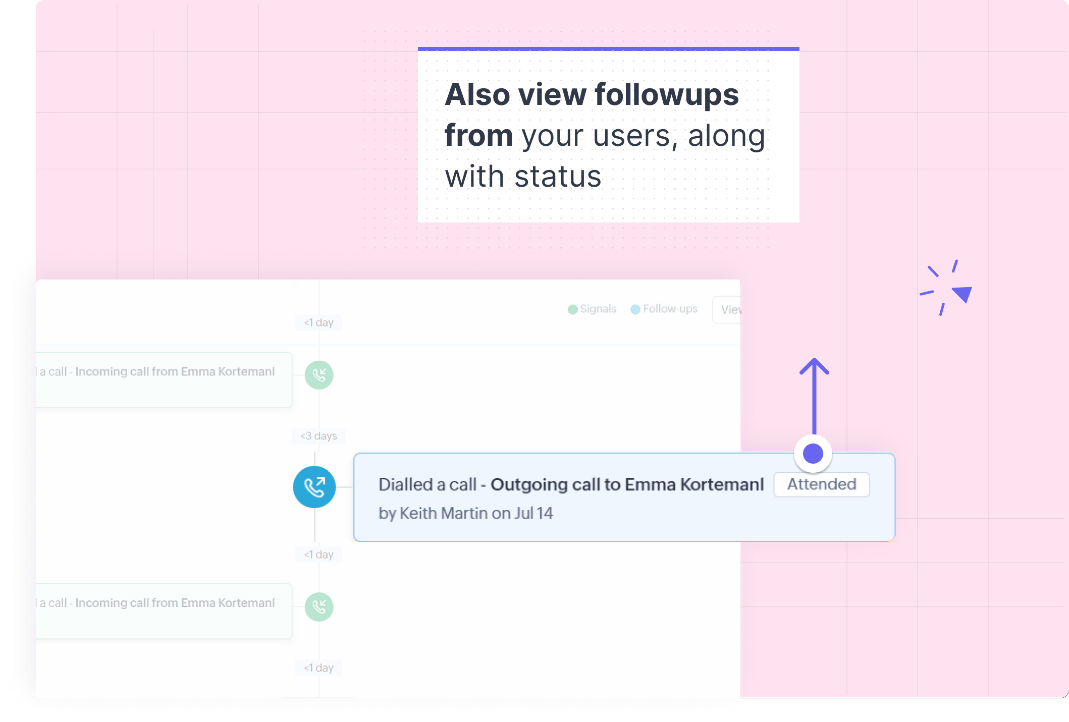 Alături de semnale, punctele de contact din parcursul clientului tău includ follow-up-uri. Acestea sunt interacțiuni inițiate de utilizatorii CRM din organizația ta. Ele includ informații despre utilizatorul CRM care a inițiat/răspuns, precum și data la care a avut loc follow-up-ul. Poți vizualiza ora exactă a follow-up-ului trecând cursorul peste data din follow-up. Sunt aranjate în partea dreaptă a traseului.