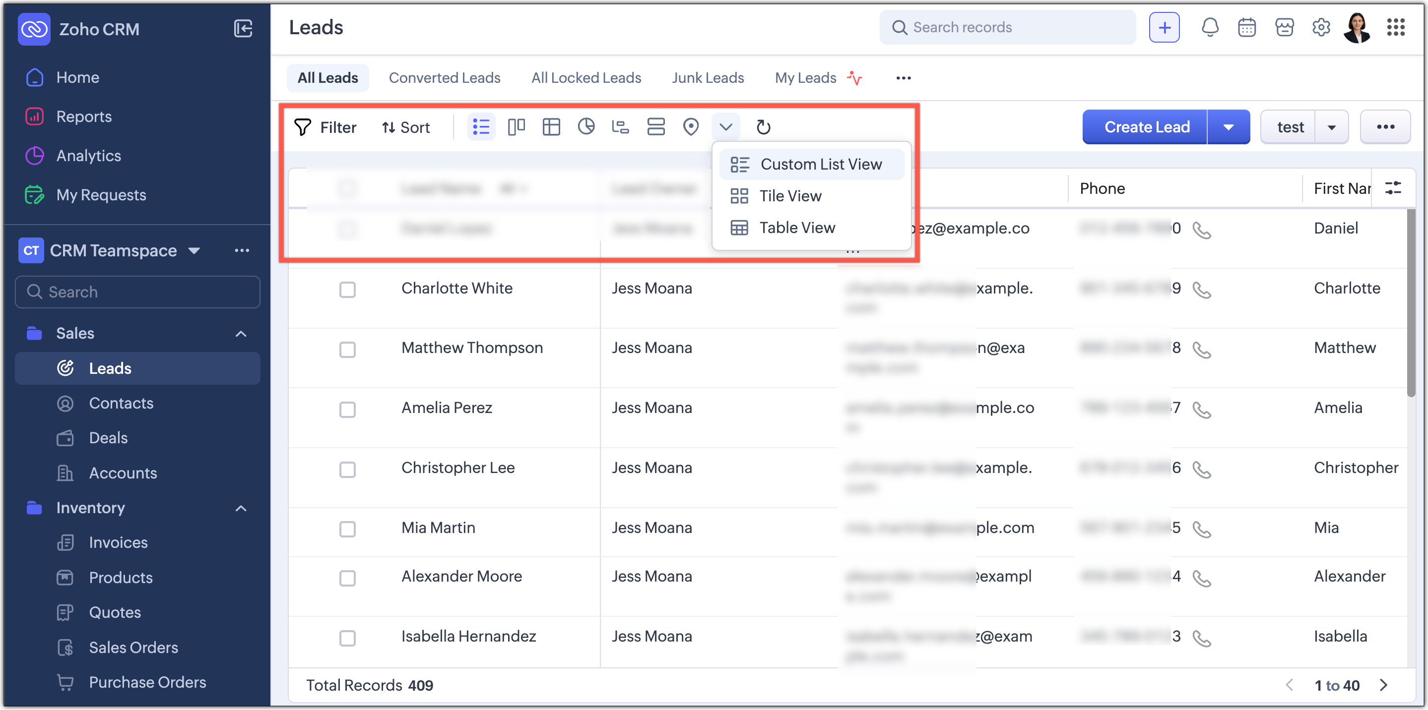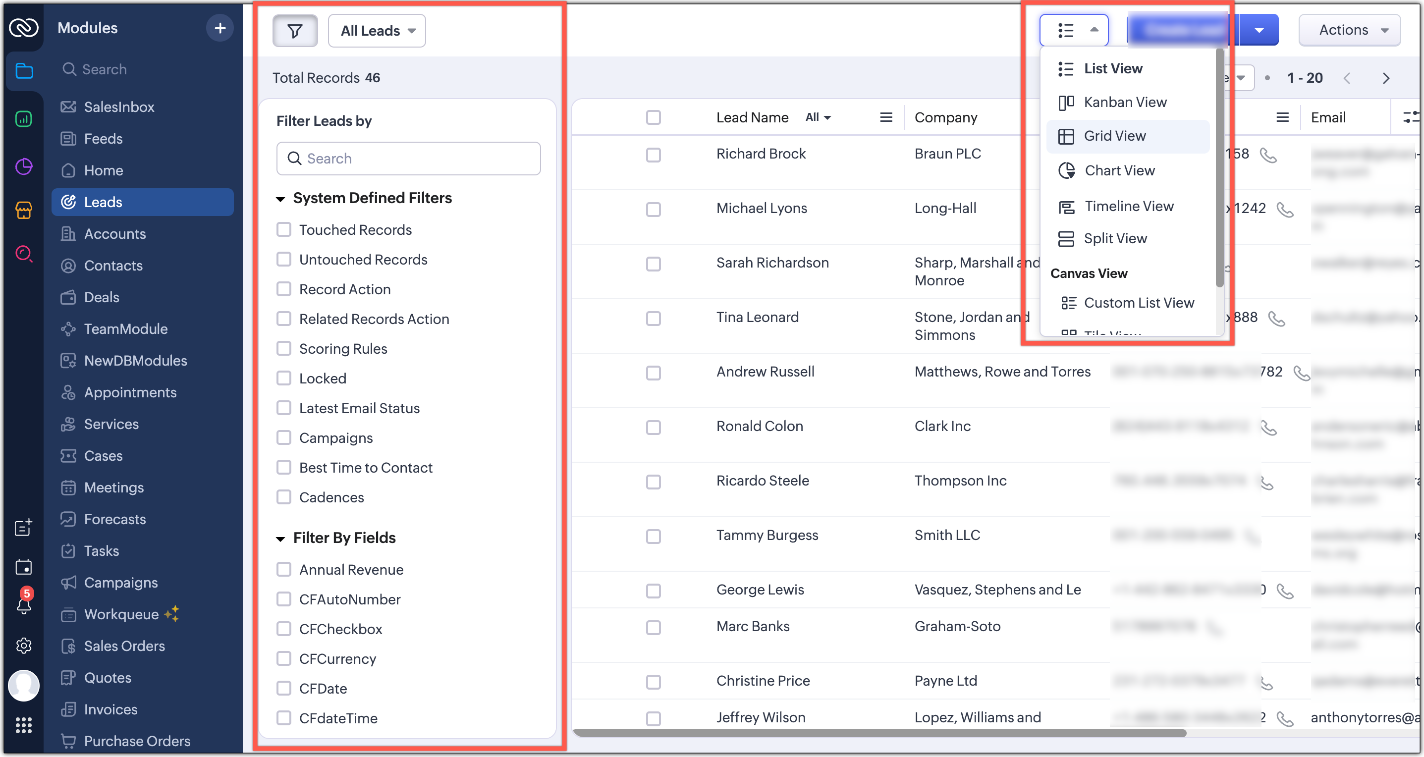 Opțiunea de filtrare, în prezent, este disponibilă separat în partea de sus, lângă opțiunea de vizualizare personalizată. Similar, vizualizarea înregistrărilor pentru modul este de asemenea plasată în partea de sus, lângă butonul Creare înregistrare și se deschide ca un meniu derulant din care poți alege.