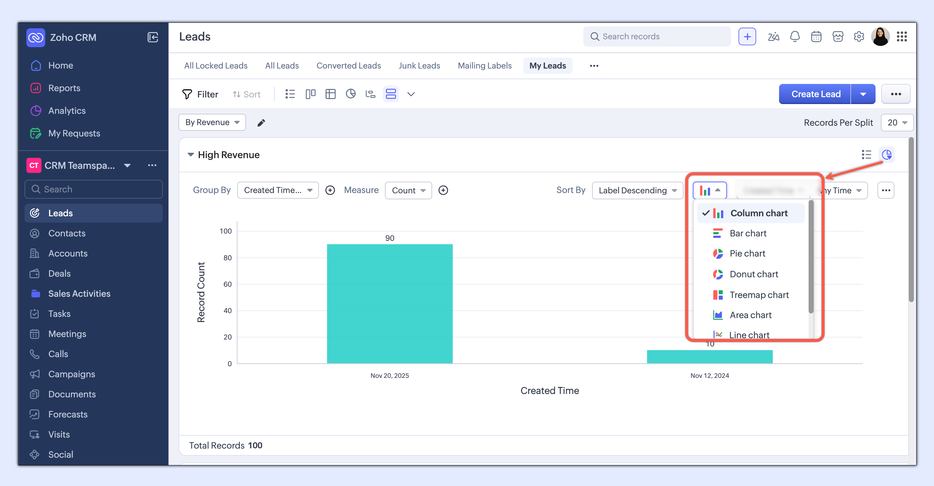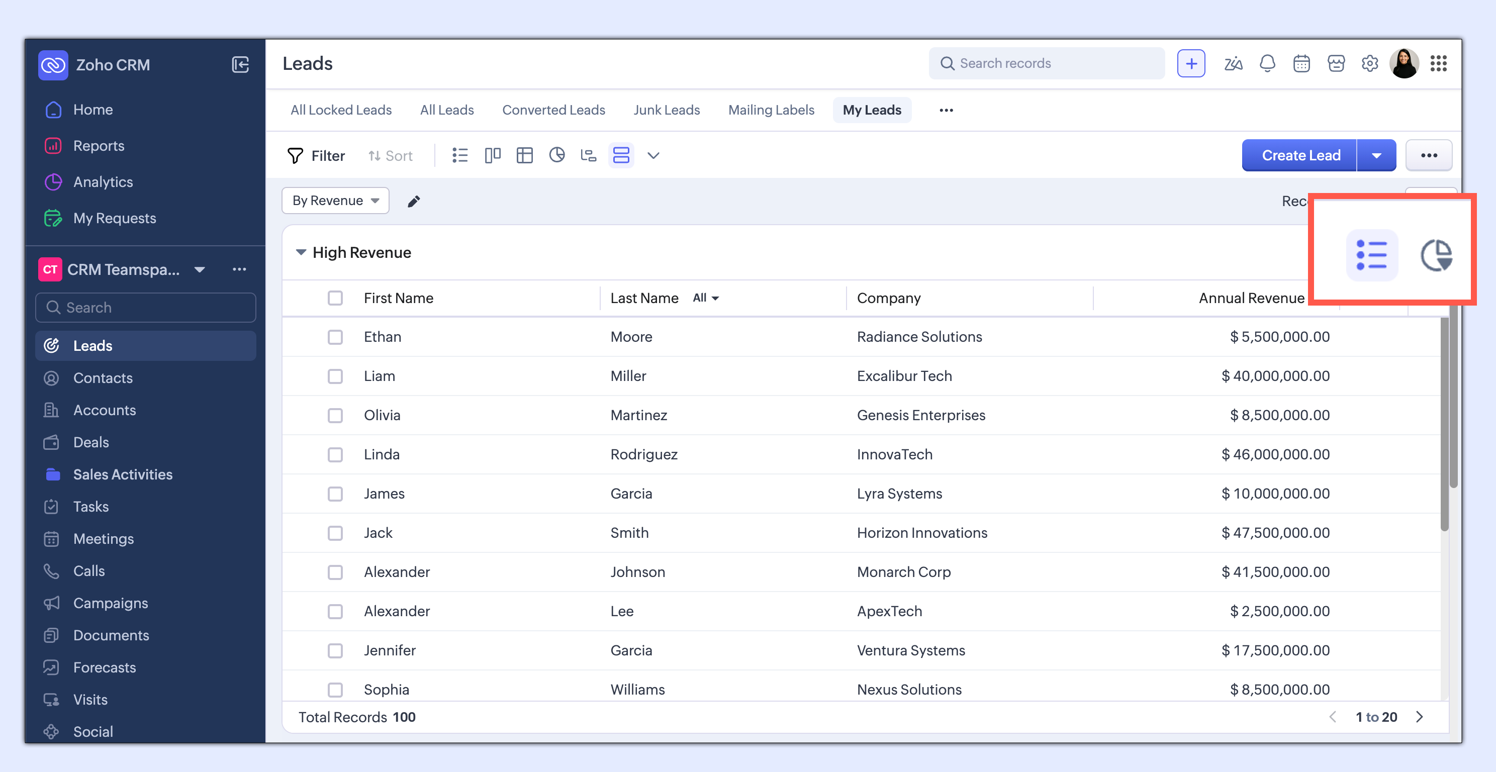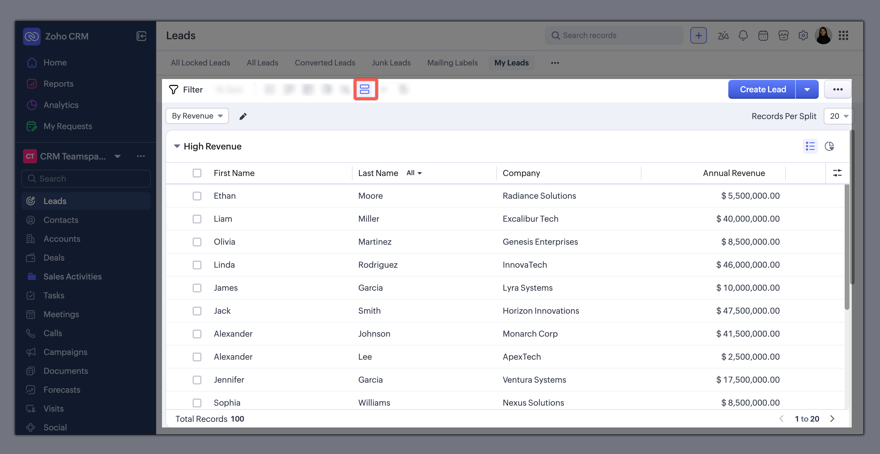 - Navighează la modulul dorit (de ex., Deals, Leads, Industry) și alege Split View.
