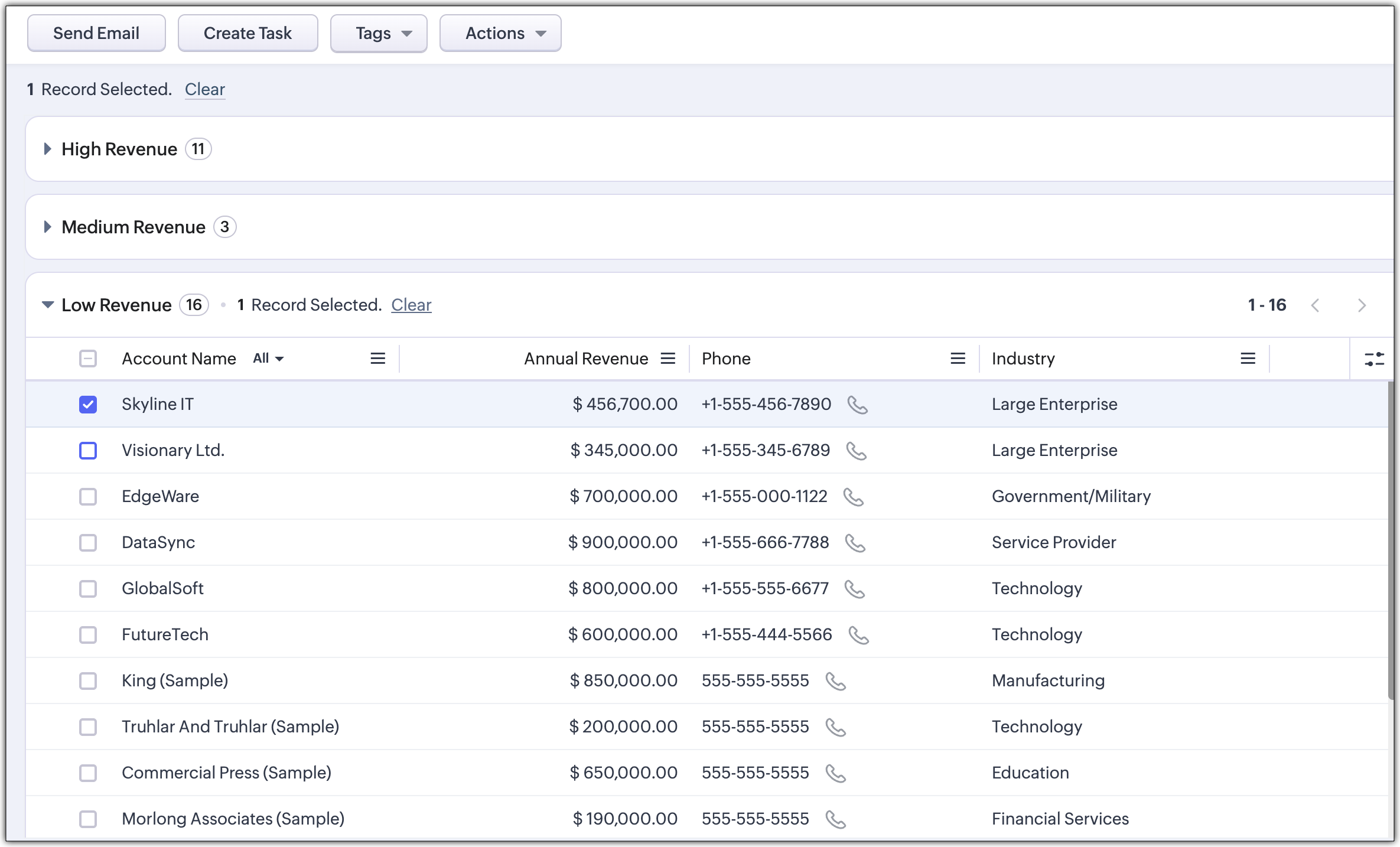 - Organizezi înregistrările împărțindu-le în mai multe tabele, pe baza unui câmp ales (de ex., Lead Source, Record Owner sau Industry).