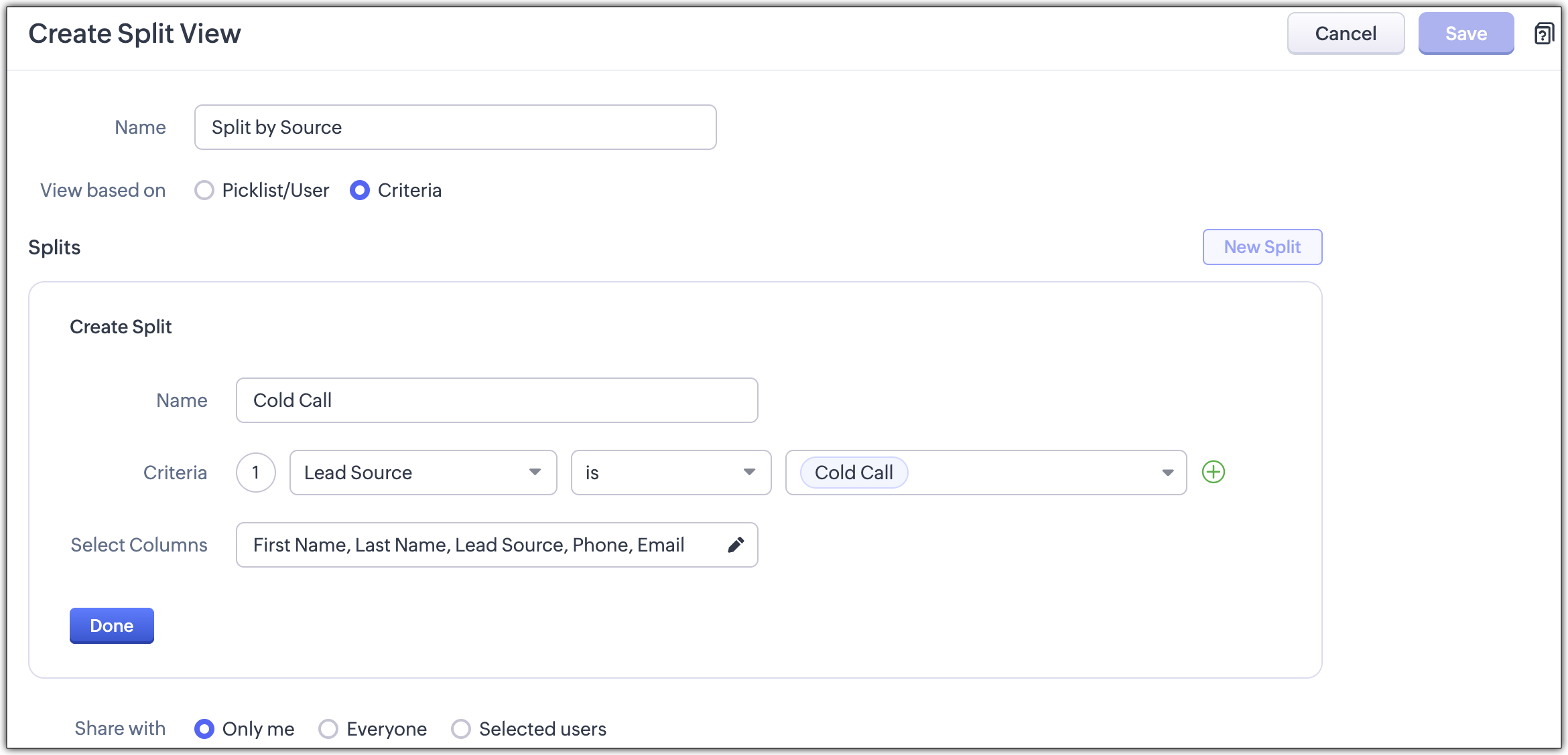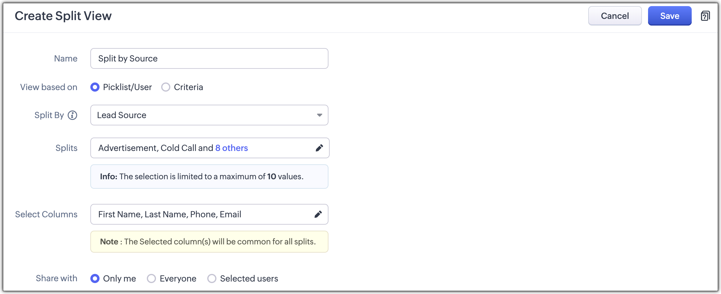 - Tipurile de date suportate pentru un split view bazat pe Utilizator sunt: Owner Lookup, Single User Lookup, Created By, Modified By, Handler