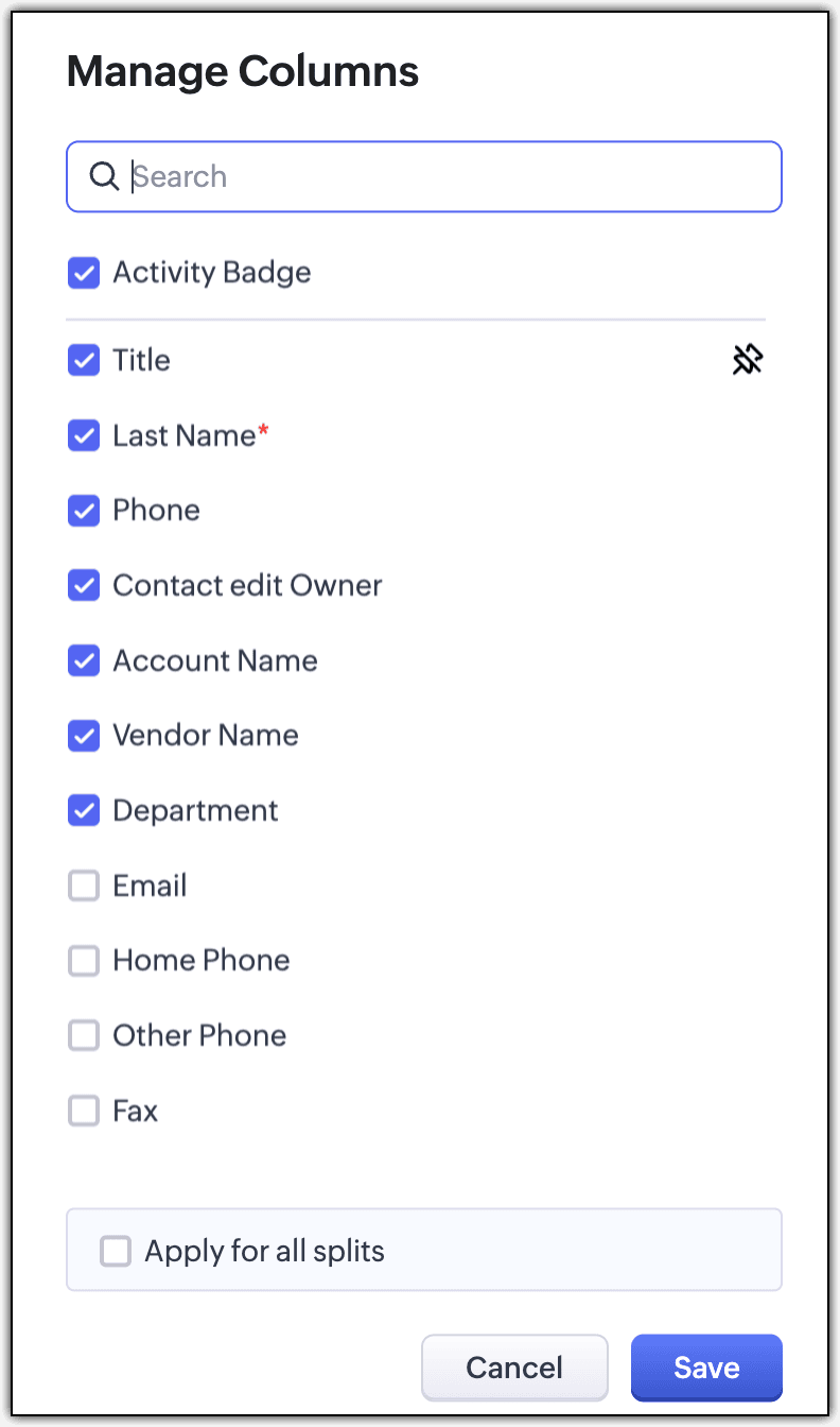 - Split View este disponibil în prezent doar în modulele care suportă vizualizarea de tip listă, doar pentru noua interfață, cum ar fi: -- Accounts, Accounts, Bundles, Custom Modules, Calls, Campaigns, Cases, Contacts, Events, Invoices, Leads, Potentials, PriceBooks, Products, Purchase Orders, Quotes, Sales Orders, Solutions, Tasks, Vendors