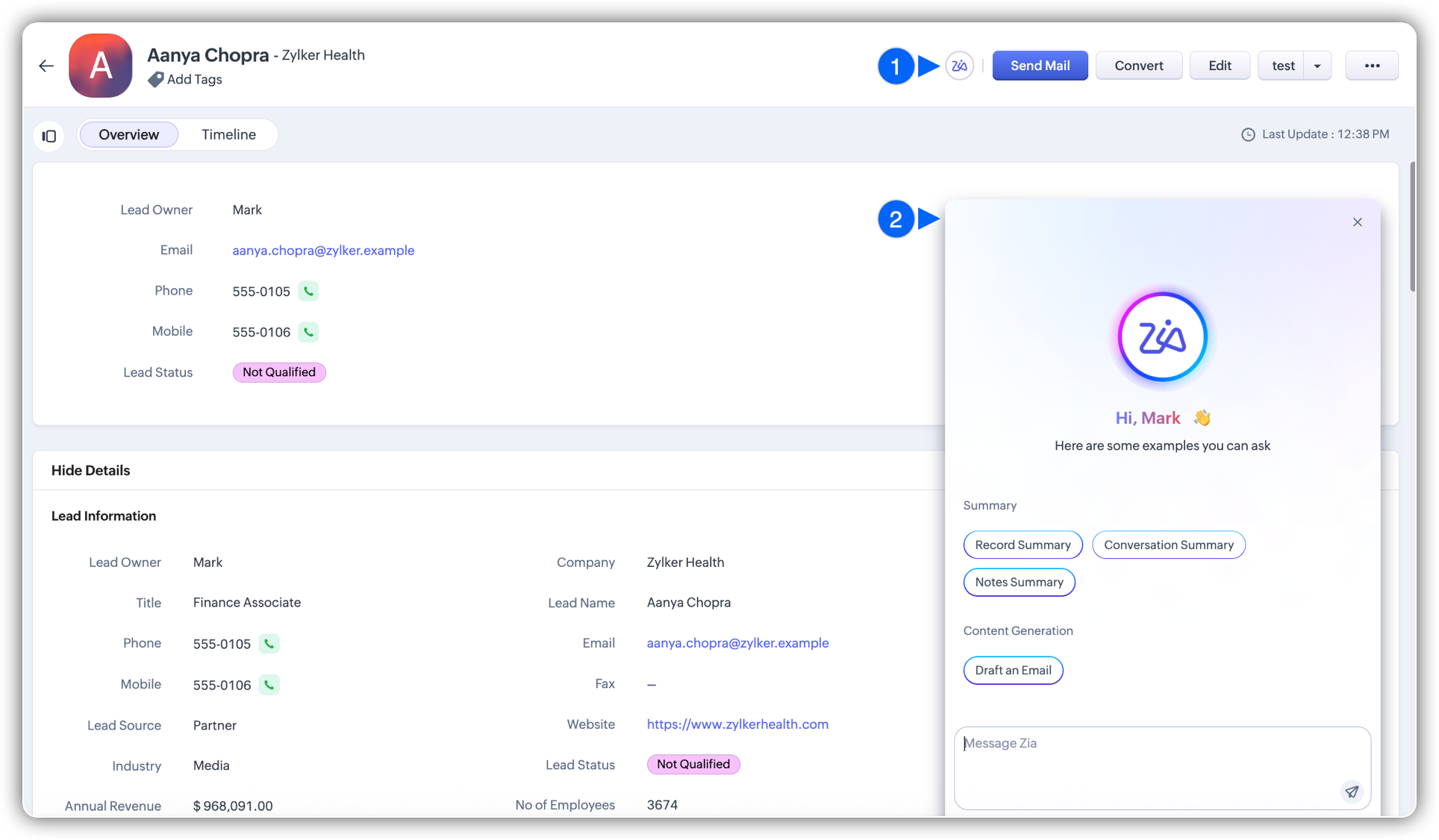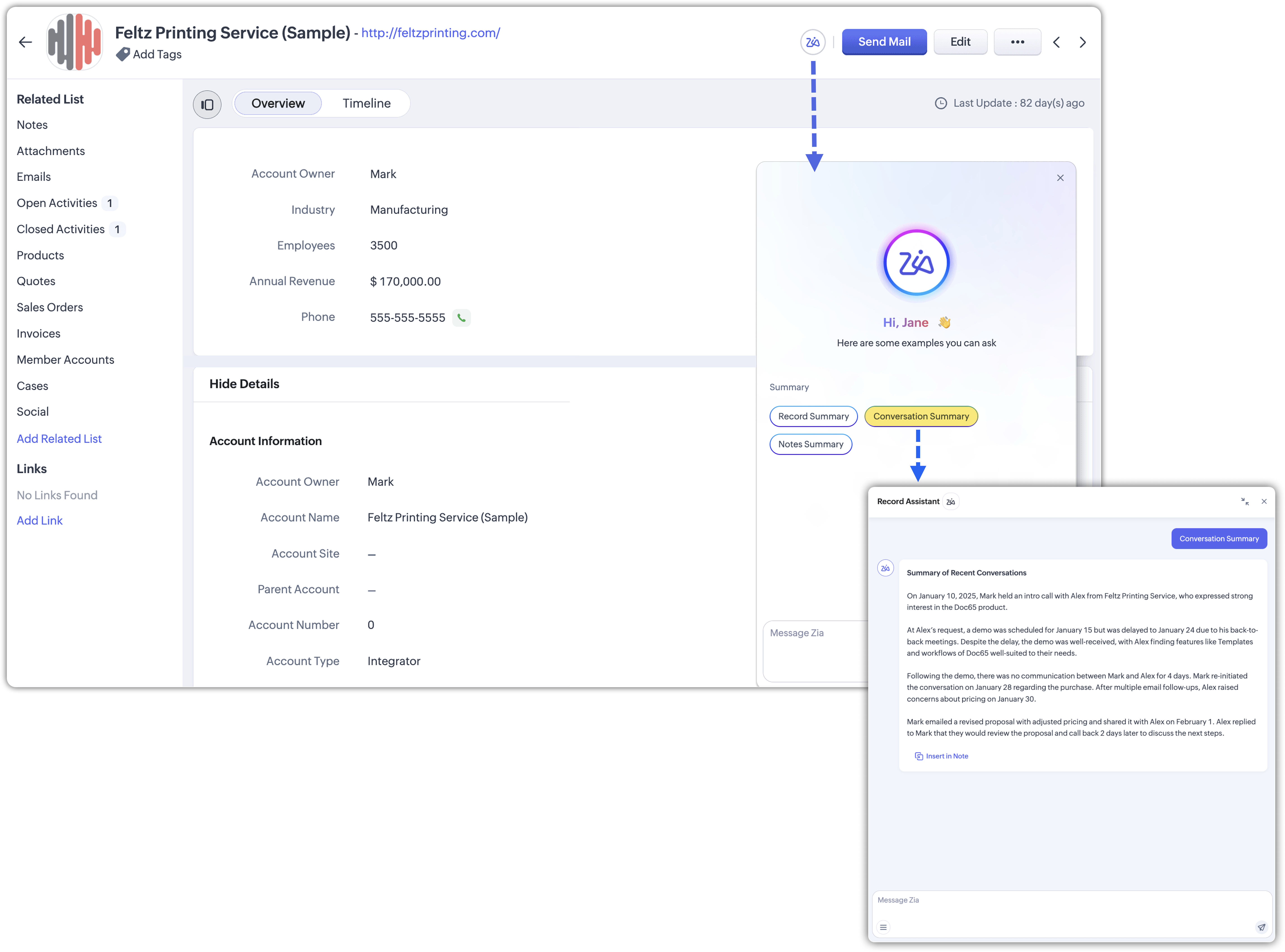 Smart Prompt este integrat în interfața Zoho CRM prin diferiți asistenți care apar în paginile de înregistrări și editoare. Principalul mod în care vei interacționa cu el este prin Record Assistant, care este disponibil în paginile de înregistrări, notițe și compunerea emailurilor.
