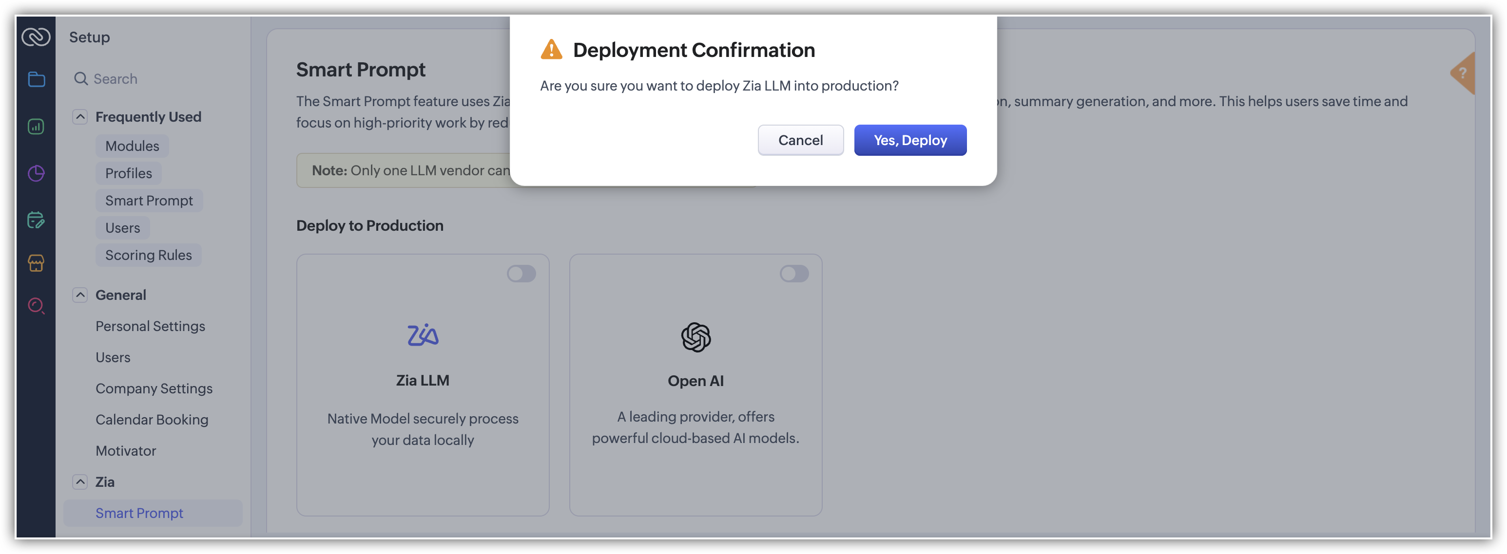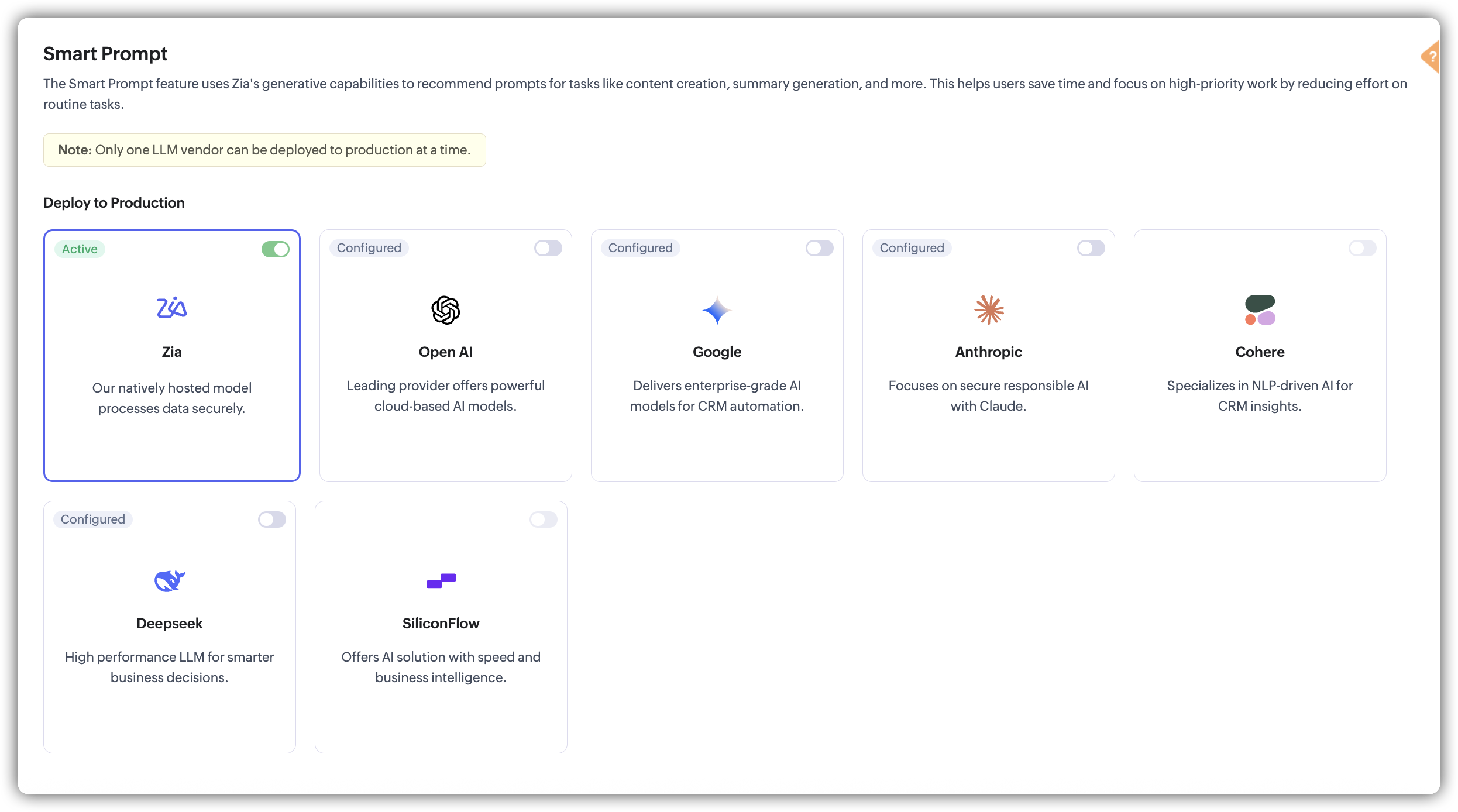 Smart Prompt integrează puterea Zia și alegerea ta de sursă LLM pentru a oferi sugestii contextuale, relevante și acționabile. De la înțelegerea datelor tale de business până la generarea de răspunsuri precise, aceste modele AI colaborează perfect, în ciuda capacităților lor distincte.