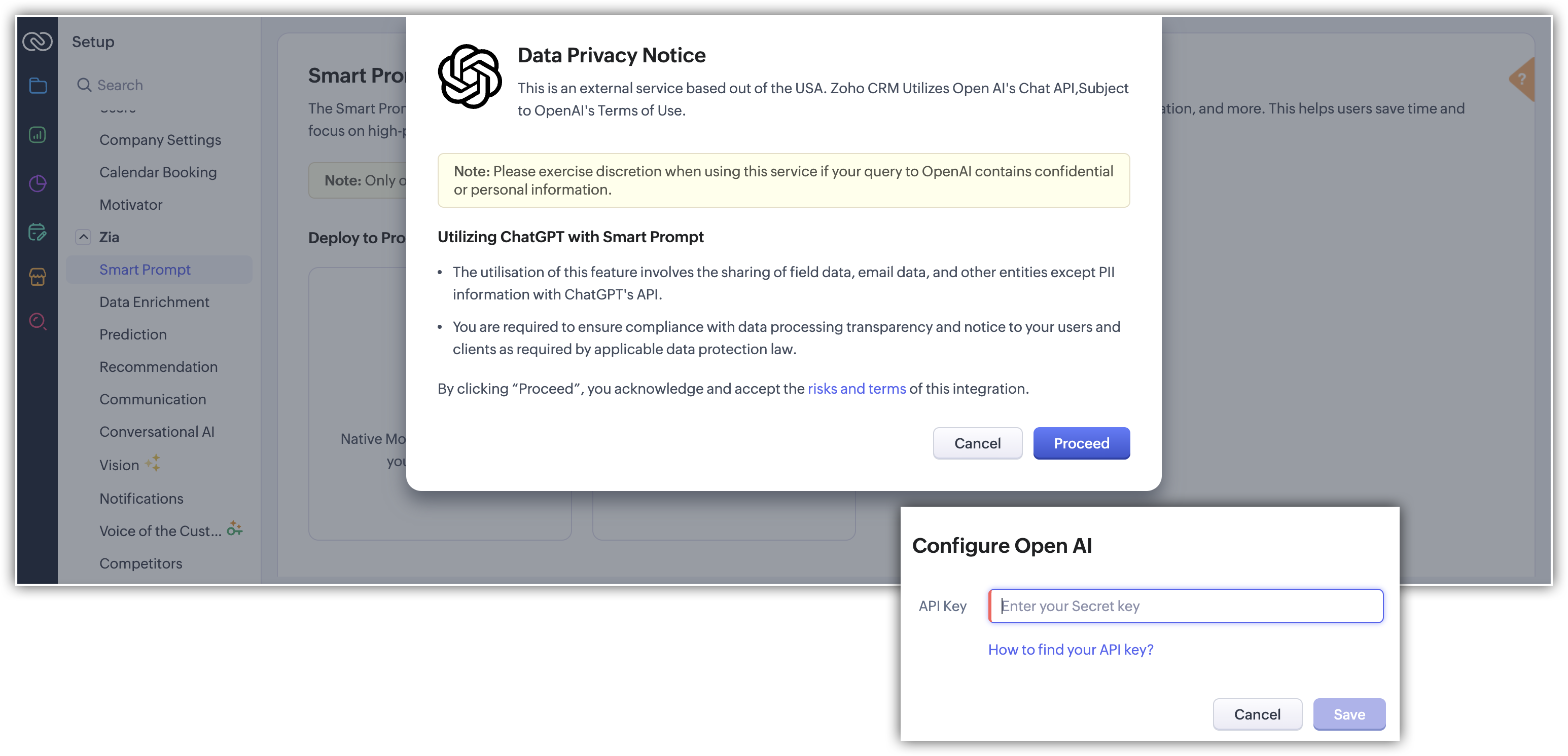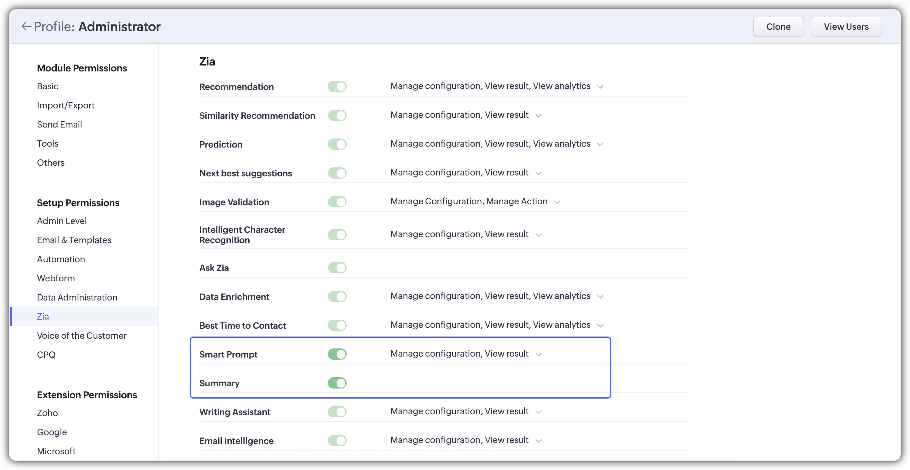 - Mergi la Setup (⚙) > Zia > Smart Prompts.