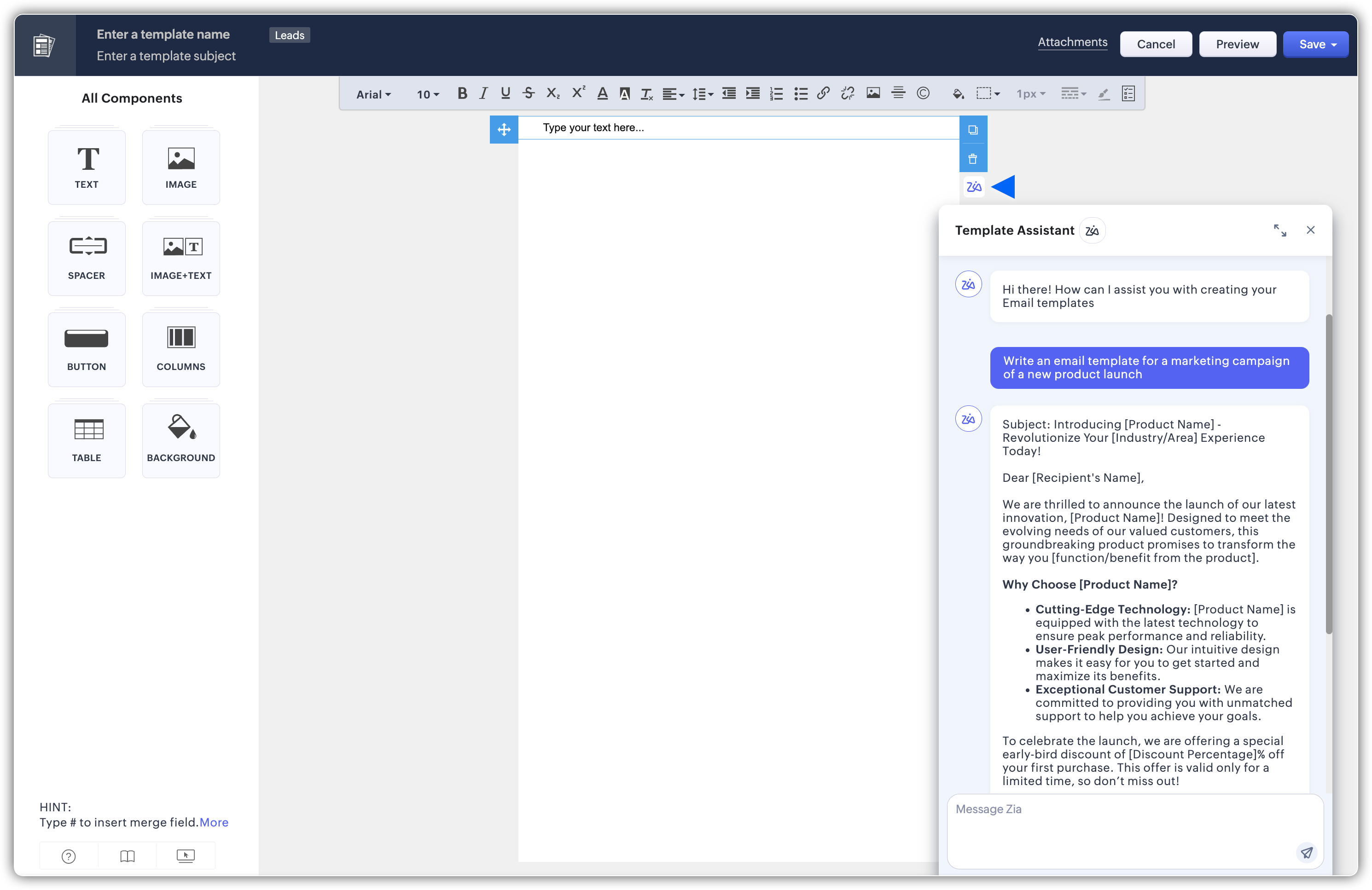 Când creezi sau editezi un șablon de email, Template Assistant te poate ajuta să construiești linii de subiect și conținut al mesajului potrivit pentru audiența și scopul tău. Poți specifica tonul, stilul sau lungimea, iar Smart Prompt va genera sugestii corespunzătoare. Template Assistant este disponibil pentru toate modelele suportate.