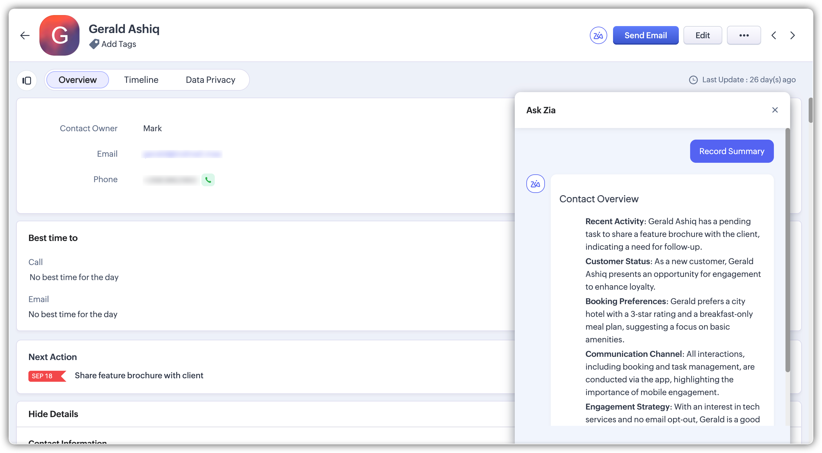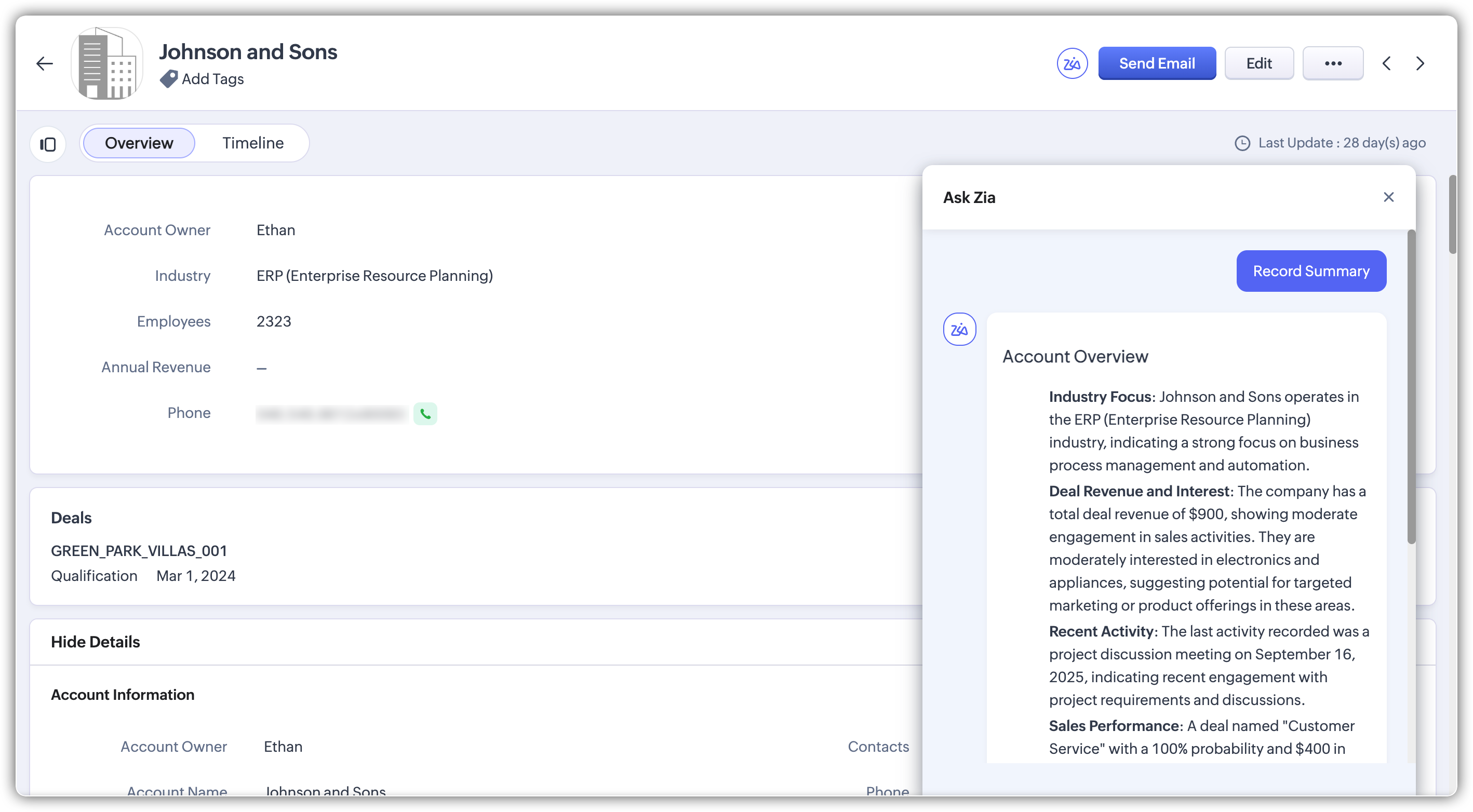 Aici intervine funcția Rezumatul Înregistrării din Zoho CRM. Este concepută să acopere acest decalaj, oferind o vizualizare consolidată a datelor critice ale înregistrării - permițându-le utilizatorilor să ia decizii rapide și informate fără a fi nevoie de navigare extensivă.