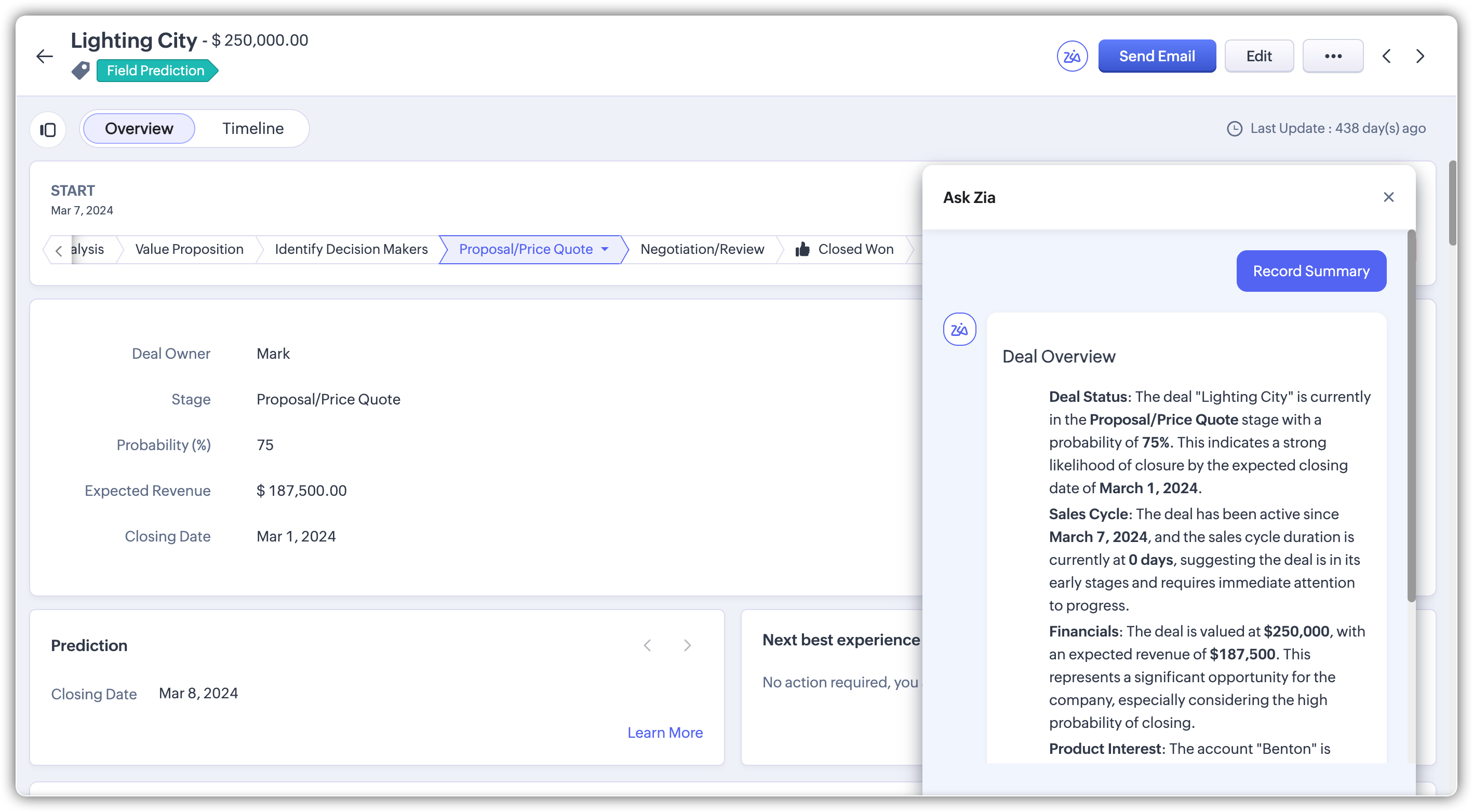 Cu funcția Rezumatul Înregistrării, Priya poate accesa toate detaliile esențiale - progresul tranzacției, sarcinile asociate, indicatorii cheie și comunicările recente - compilate într-o singură vizualizare. Acest lucru îi permite să abordeze problemele cu încredere și să ofere actualizări precise în timp real.
